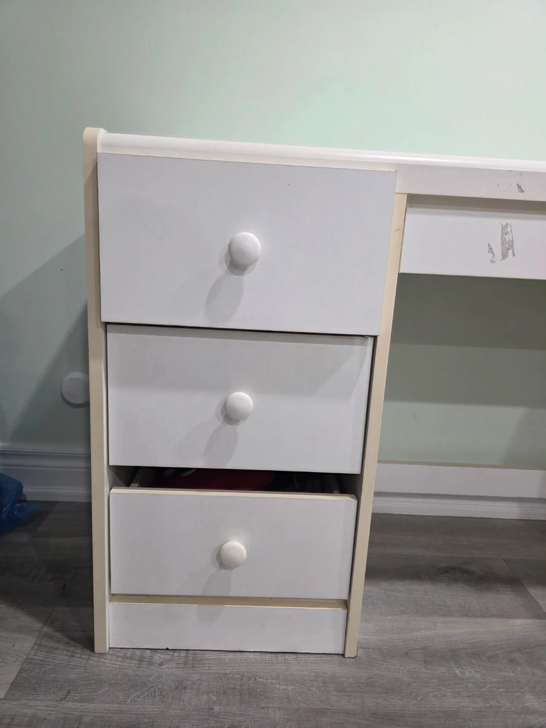 White desk with four drawers and has simple white knobs for its drawers. It's suitable for a home office or study space. Only the table is available for free.