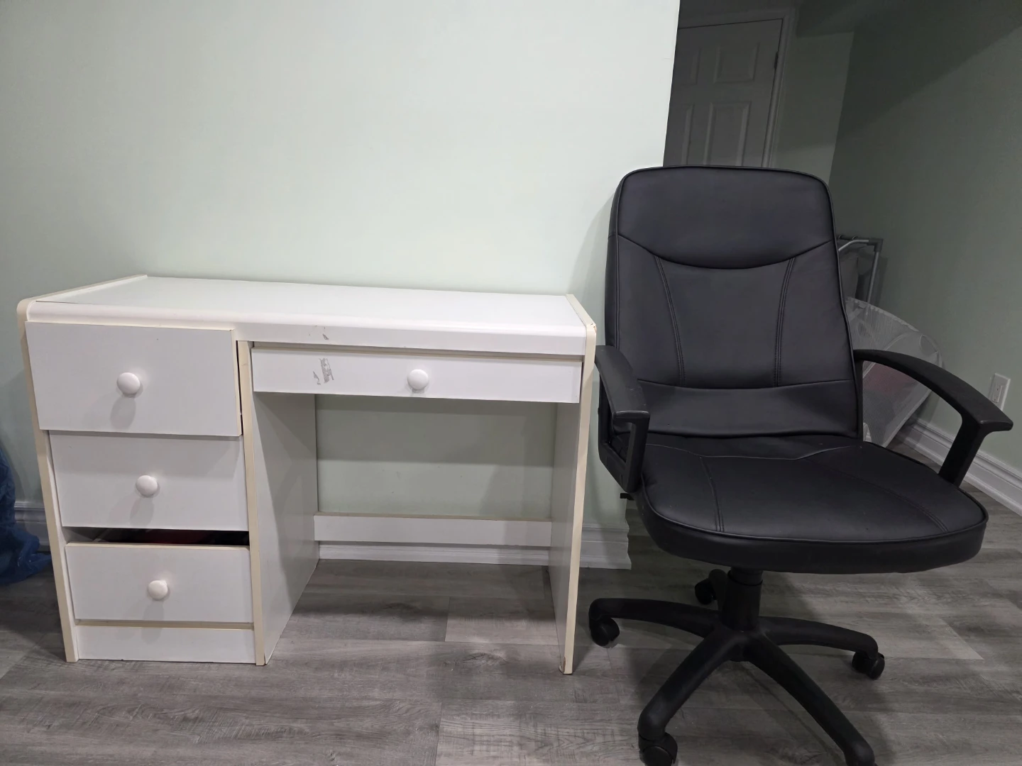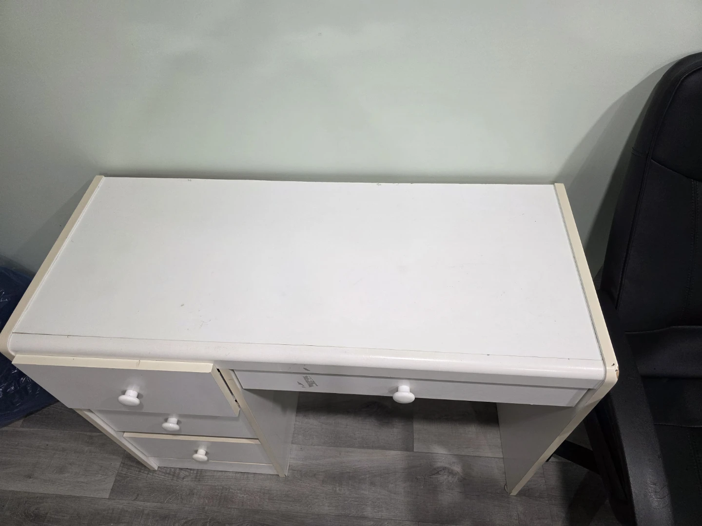 White desk with four drawers and has simple white knobs for its drawers. It's suitable for a home office or study space. Only the table is available for free.