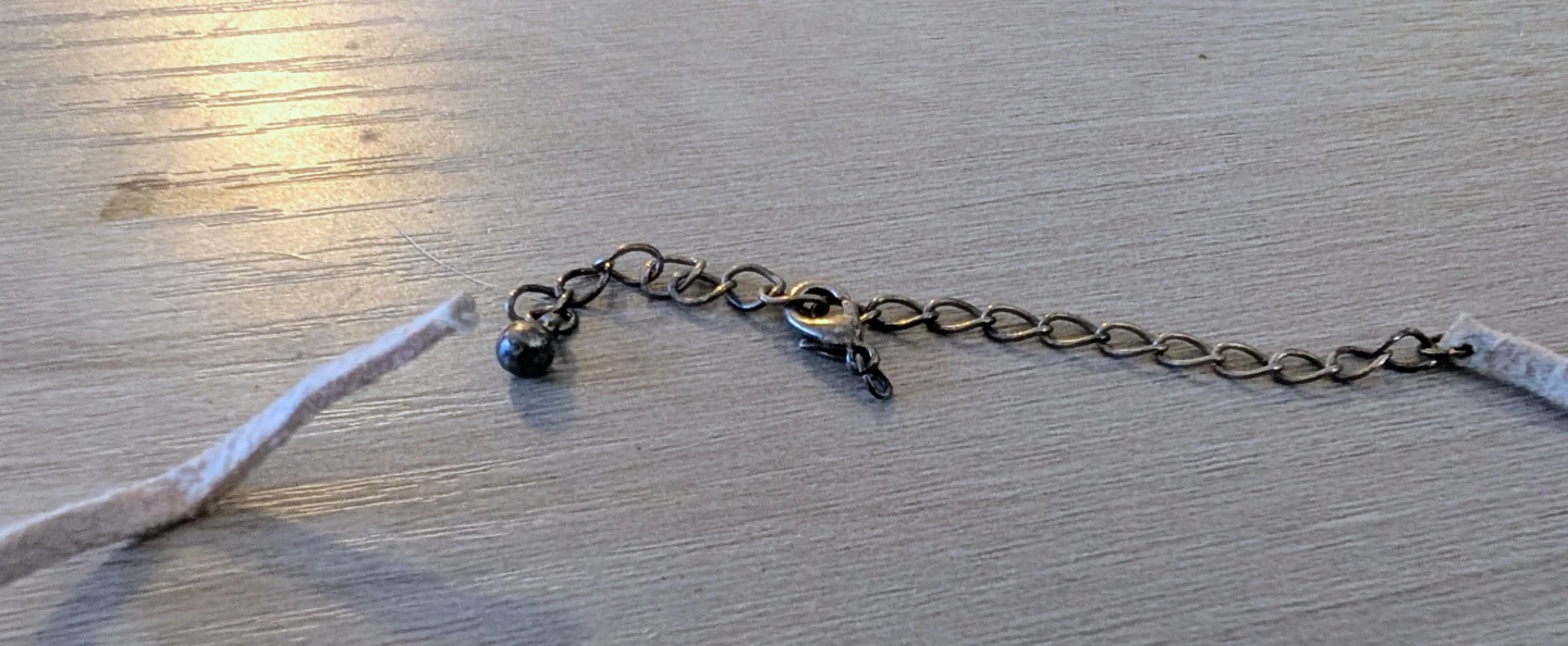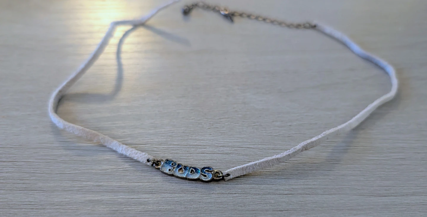 This is a cute white suede choker necklace with "BUDS" spelled out in blue and white mosaic-style letters. As shown in photos, it is broken, but hoping someone can repurpose it.