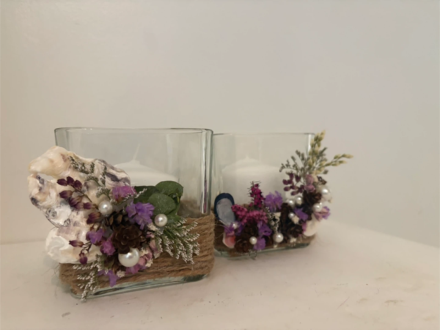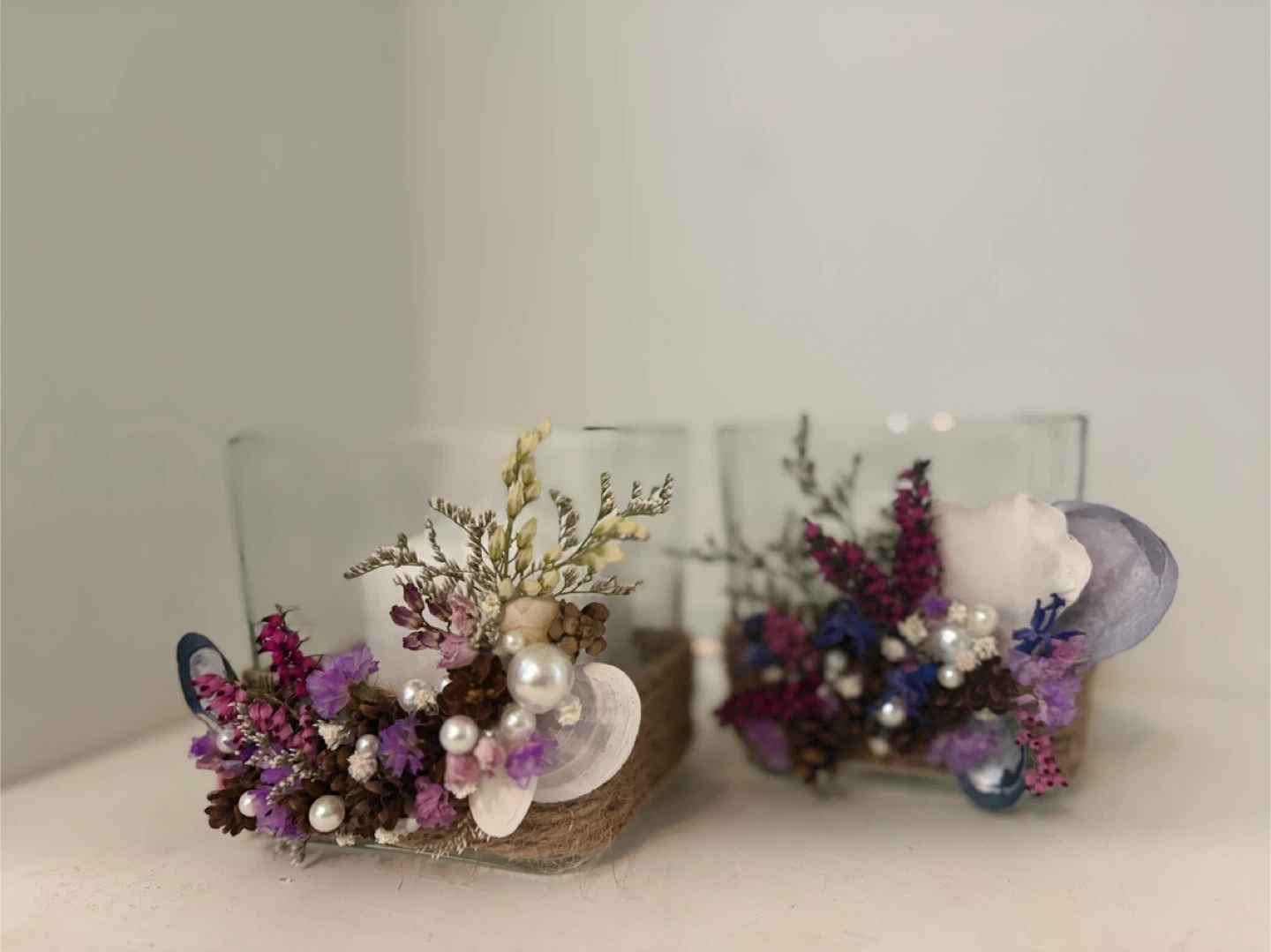 A set of two clear glass candle holders, each adorned with dried flowers, pinecones, seashells, and pearls. Each holder comes with a white pillar candle. These decorative pieces add a rustic and charming touch to any space.