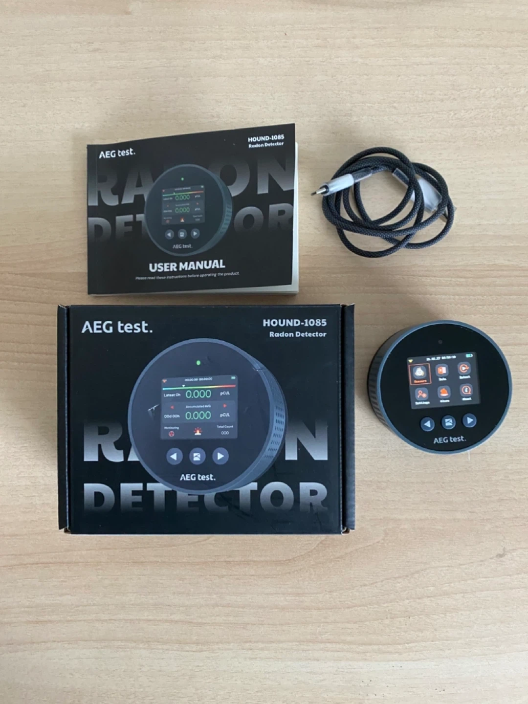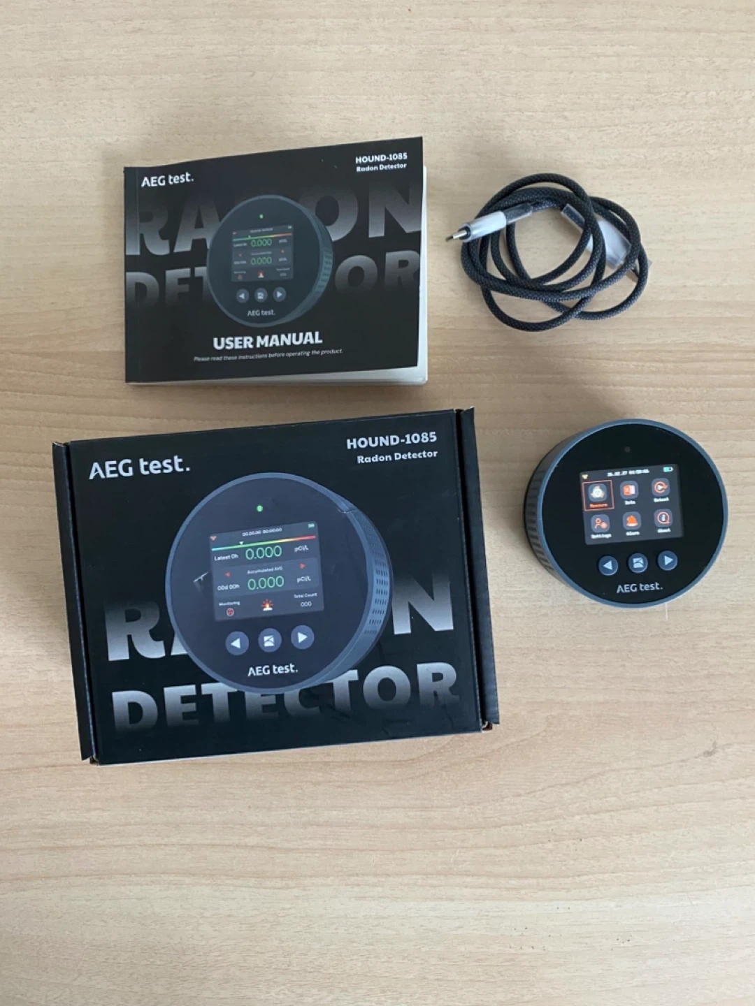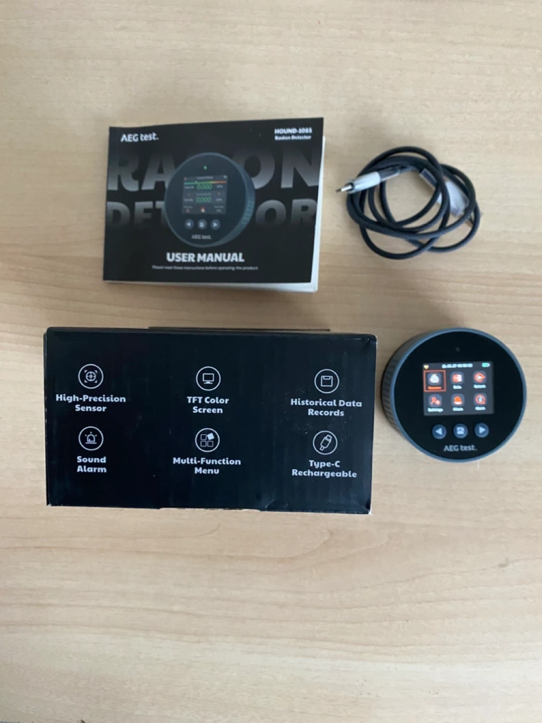 AEG HOUND-1085 Radon Detector. High-precision sensor with TFT color screen and sound alarm. Historical data records are available. Type-C rechargeable.