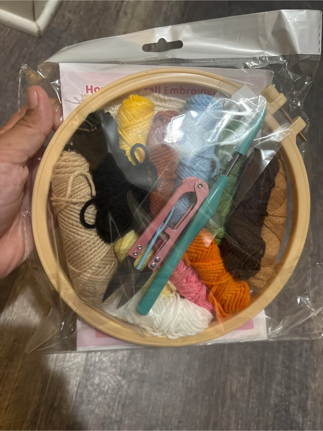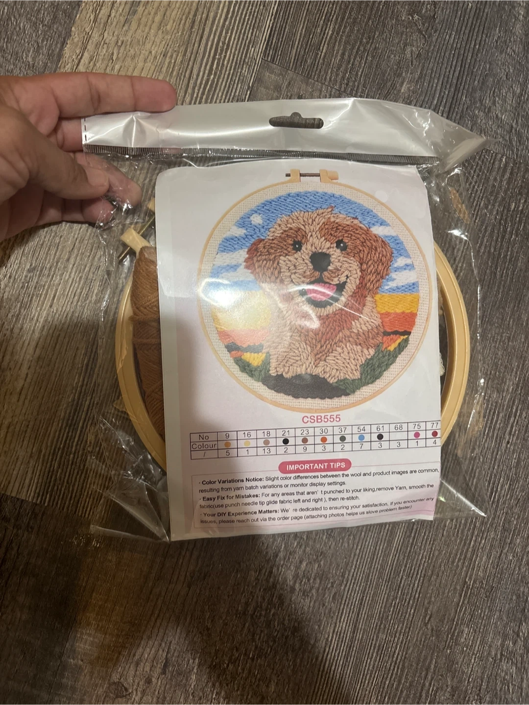 I'm selling a brand new DIY punch needle embroidery kit! It features an adorable dog design and comes with everything you need to get started. The kit includes various yarn colors, a punch needle, scissors, and an embroidery hoop. It's a fun and relaxing craft project for all skill levels