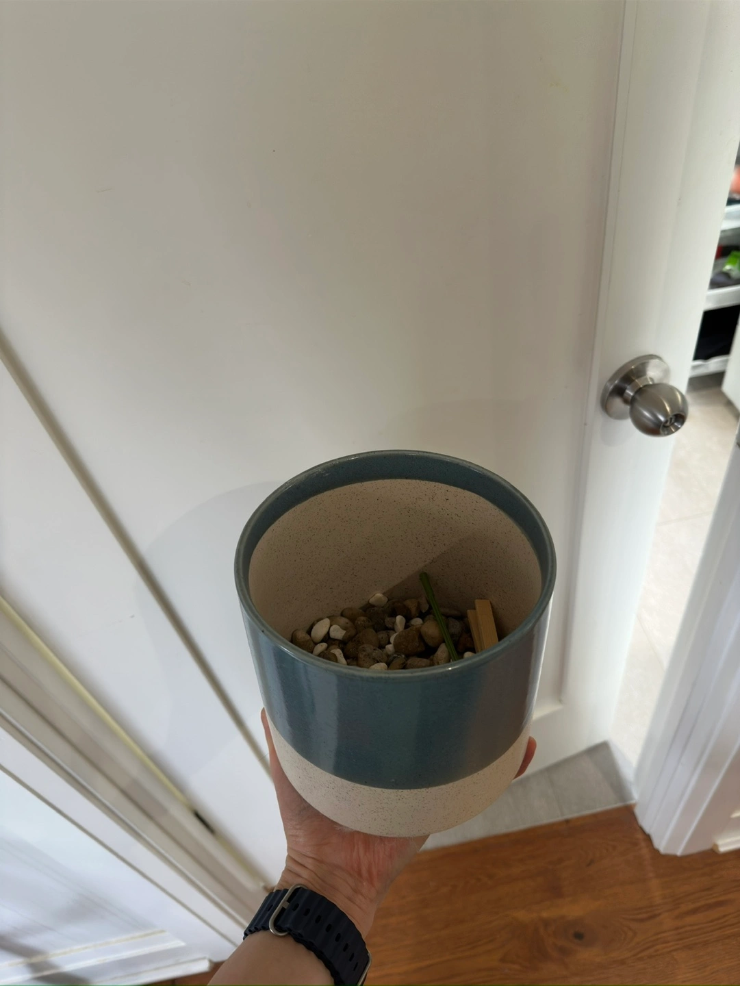 Ceramic planter with a blue and white glaze. Good condition, no cracks or chips.