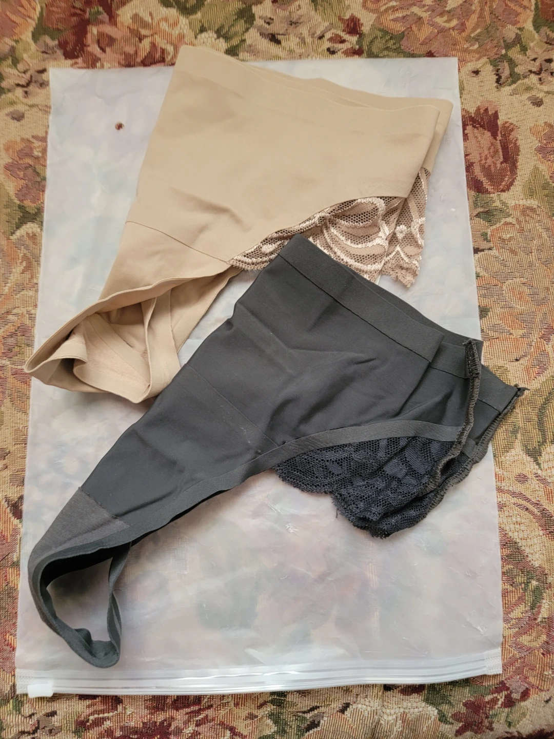 Two pairs of comfortable underwear, one tan and one dark grey. They feature a no-show lace trim design for a smooth look under clothing. Made with soft, stretchy material for all-day wear.