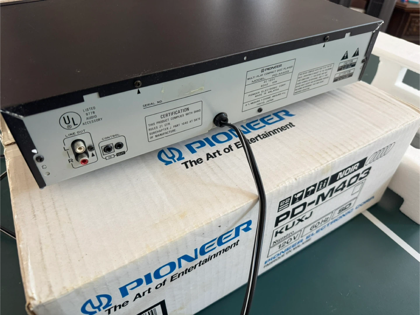 This is a Pioneer PD-M403 multi-play CD player. It's black and runs on 120V, 60Hz. This player was made in Japan. It's a compact disc player.