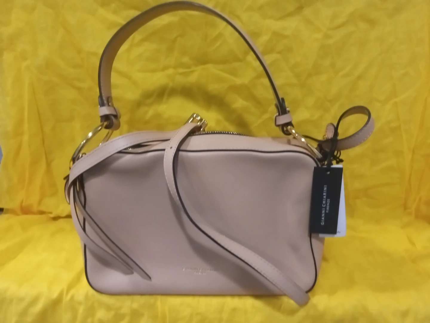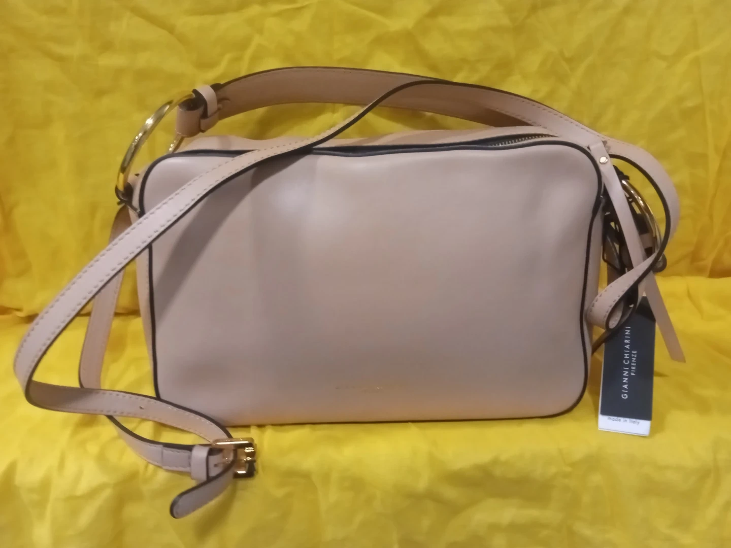 This Gianni Chiarini Firenze shoulder bag is made in Italy. Soft leather it features a taupe-coloured leather exterior with gold hardware. Includes a detachable strap for versatile wear. Great for everyday use!