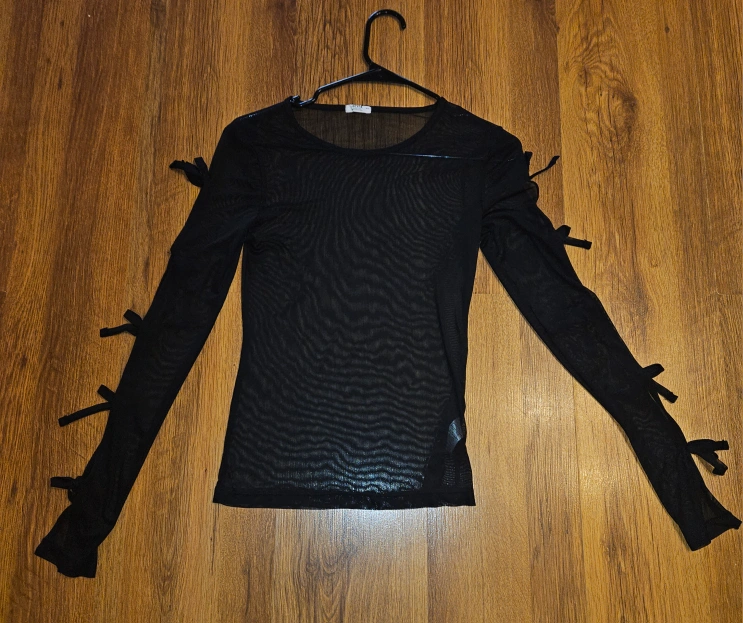 Please pick up due to no vehicle thank you. Long-sleeved top ready to wear. Black with a mesh material, and decorative bows on the sleeves. This would be a fantastic addition to any wardrobe.