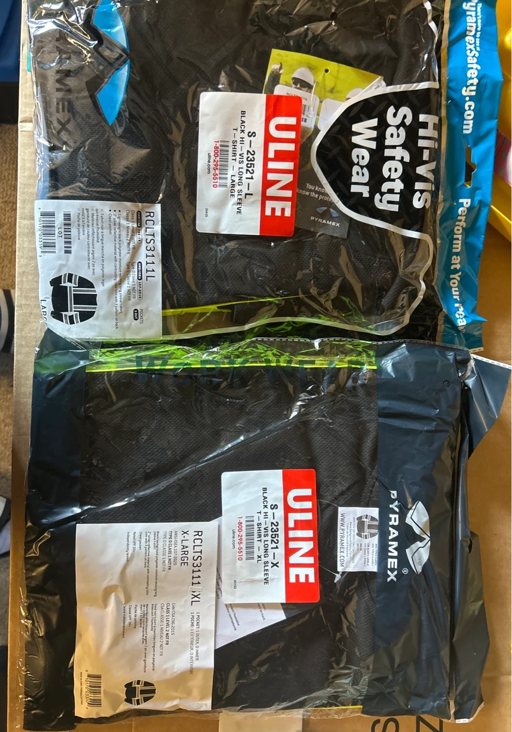 Two Pyramex hi-vis long sleeve t-shirts in black. One large and one extra-large. They're made of lightweight, moisture-wicking polyester with reflective material and chest pockets. Rated UPF 30+.