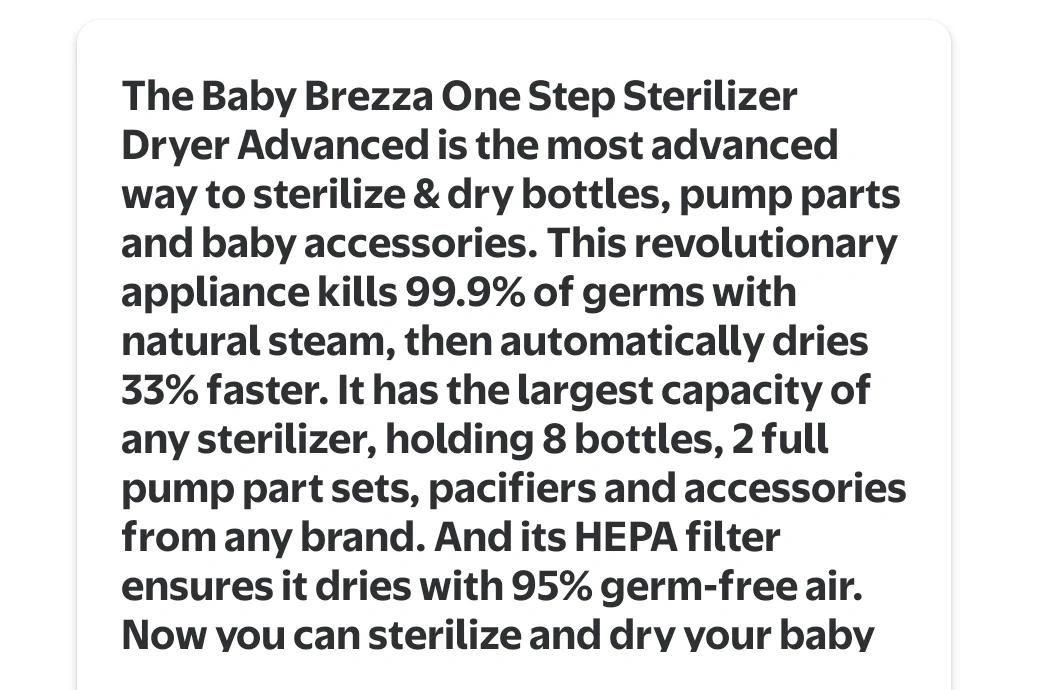 The Baby Brezza One Step Sterilizer Dryer Advanced sterilizes and dries bottles, pump parts, and baby accessories. It kills 99.9% of germs with natural steam and dries 33% faster. It holds 8 bottles, 2 full pump part sets, pacifiers, and accessories, with a HEPA filter for 95% germ-free air.