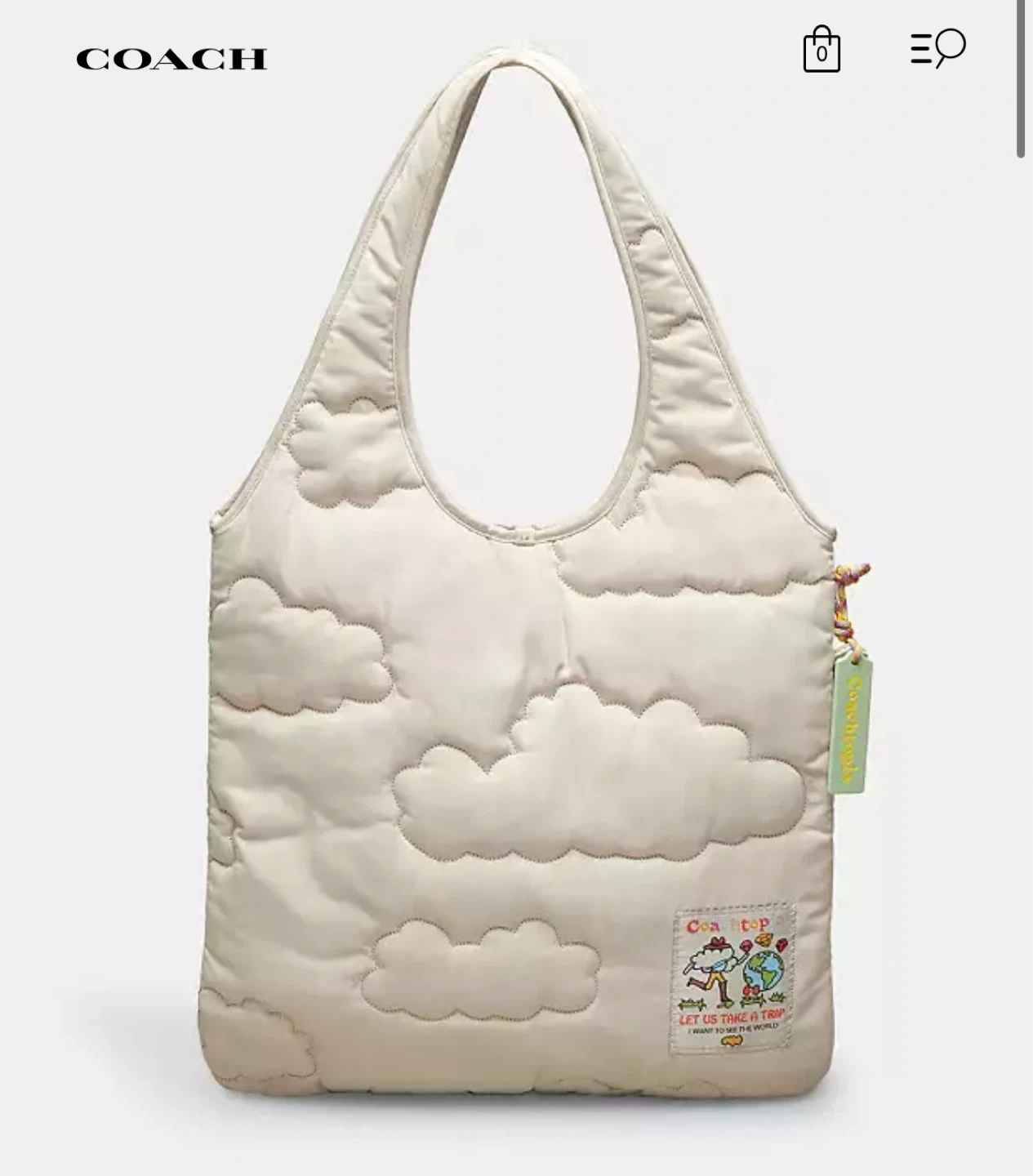 A cream-colored quilted puffy tote bag from Coach featuring a cloud pattern. Super lightweight and cute for all seasons! Brand new with tag. Retails for $195