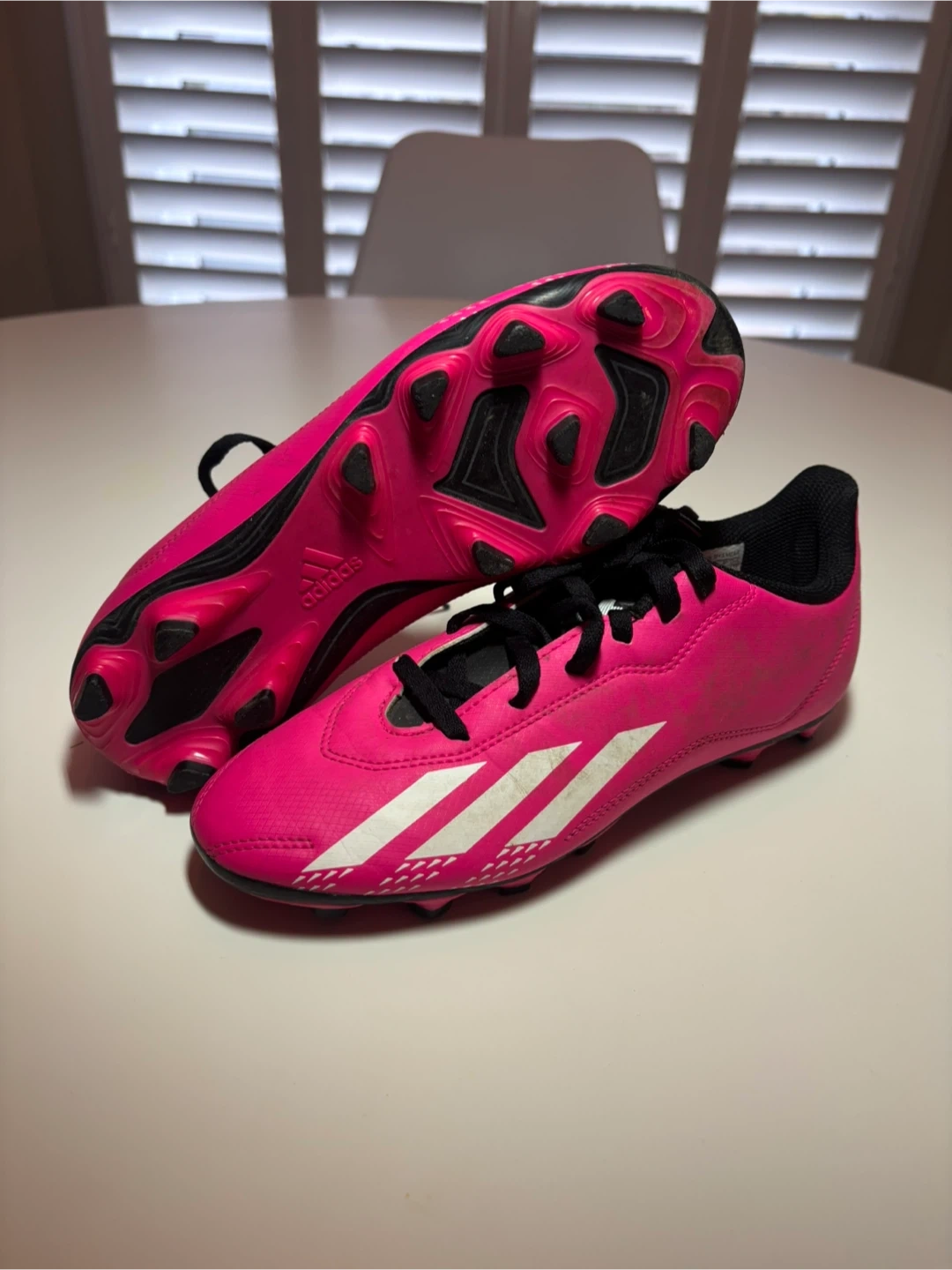 Adidas pink soccer cleats. Size is US 4 youth. These cleats are great for playing soccer on turf or grass!