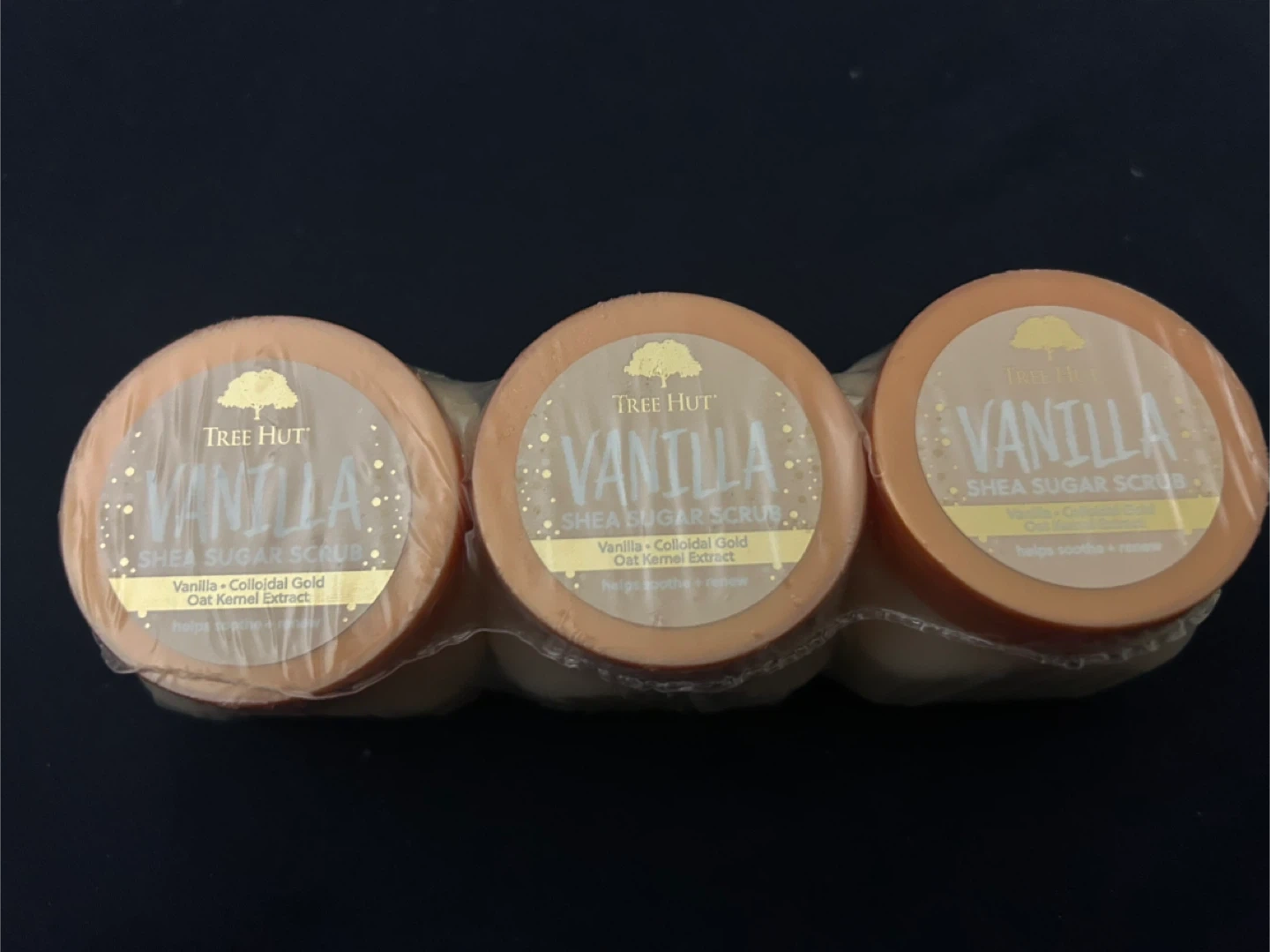 3 pack Brand new, unopened: Tree Hut Vanilla Shea Sugar Scrub in a convenient 3-pack. Made with shea butter, sugar, and vanilla extract. Helps soothe and renew skin.