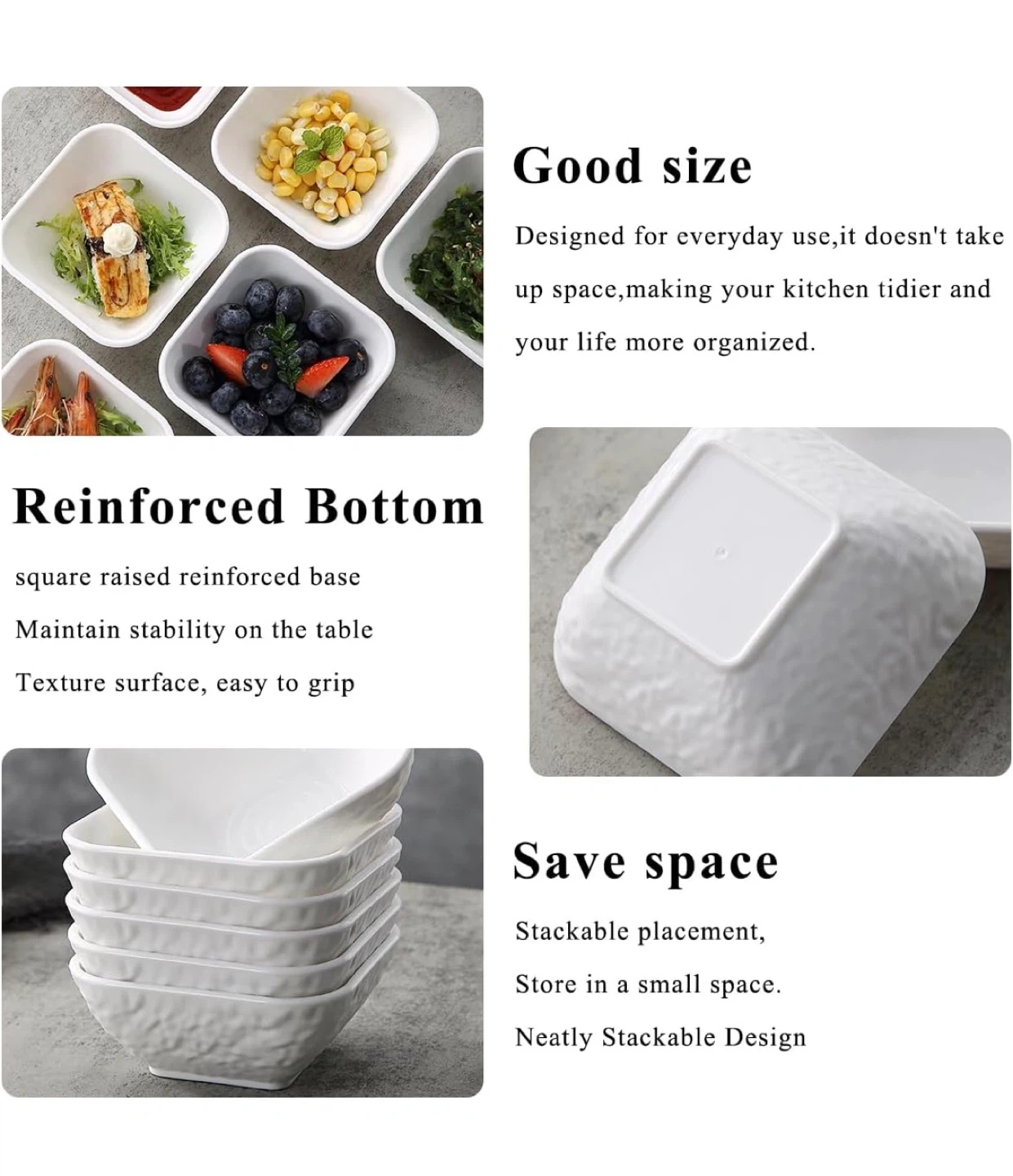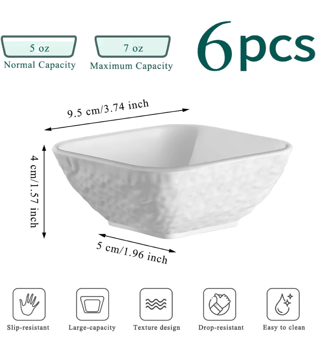 Set of six white square textured bowls. Each bowl has a normal capacity of 5 oz and a maximum capacity of 7 oz. They measure 9.5 cm by 5 cm with a height of 4 cm. Perfect for serving dips, sauces, or small appetizers!