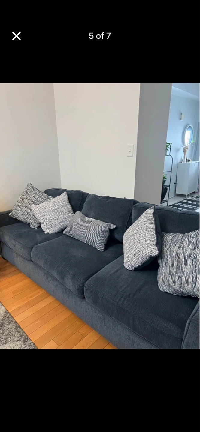 Comfortable dark blue fabric sectional sofa. Comes with five decorative pillows. Plenty of seating for family and friends!