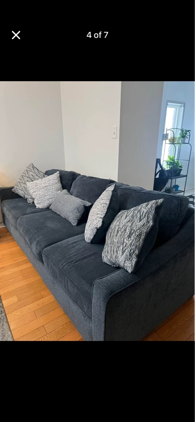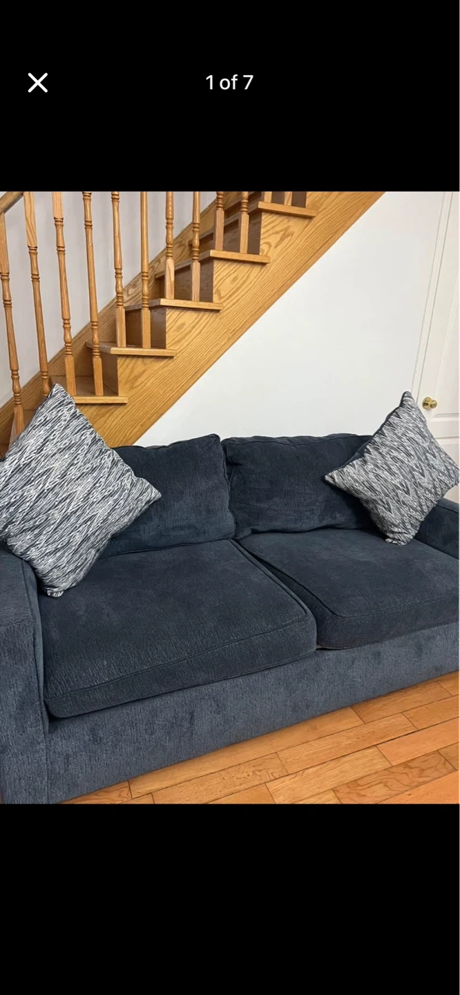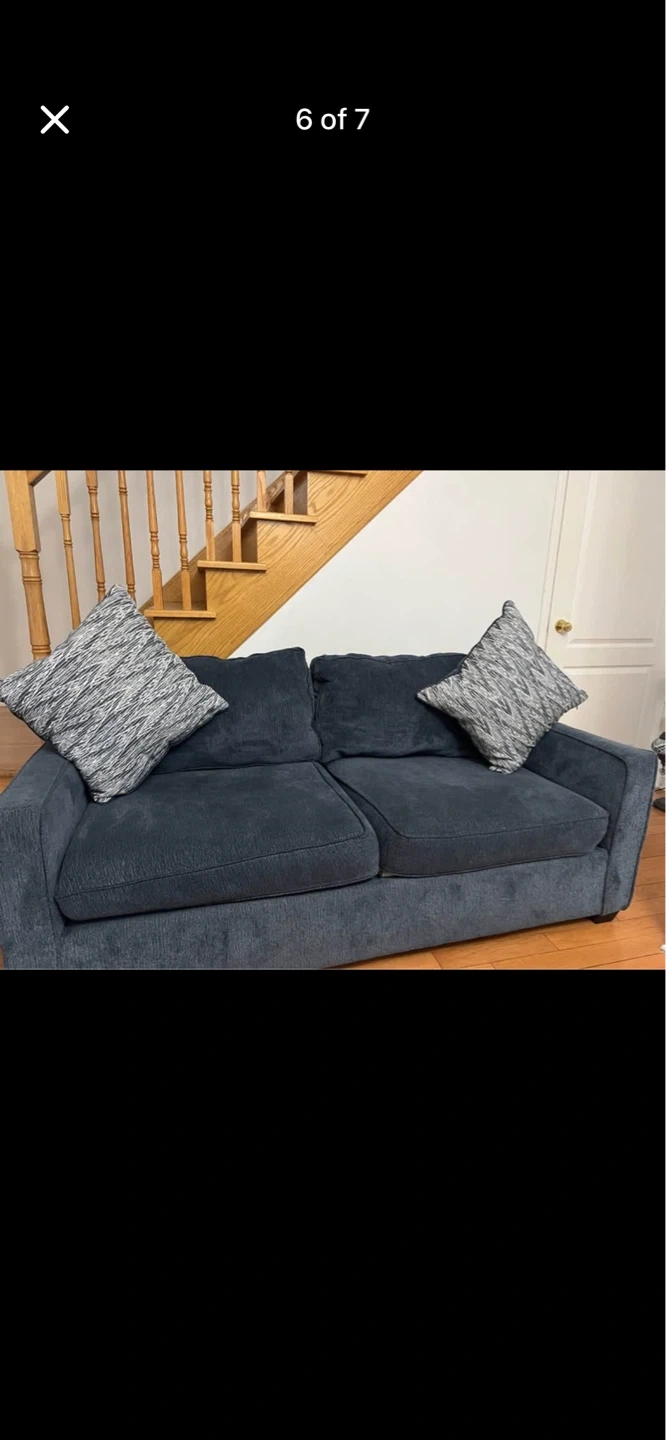 Comfortable dark blue fabric sectional sofa. Comes with five decorative pillows. Plenty of seating for family and friends!