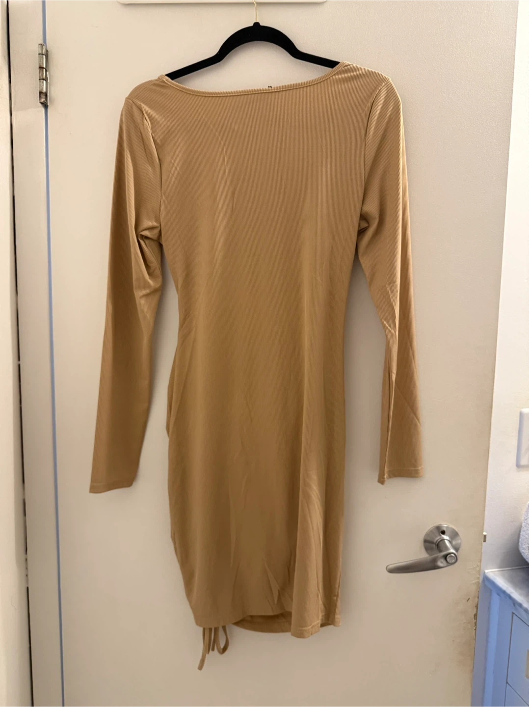 This tan mini dress features a ribbed knit fabric with long sleeves and a flattering ruched drawstring detail on the side. It has a stylish cutout in the front and a scoop neckline. Material is soft and stretchy.