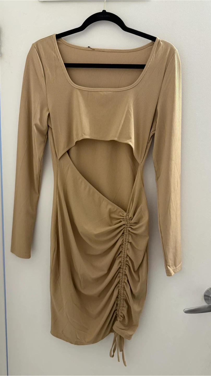 This tan mini dress features a ribbed knit fabric with long sleeves and a flattering ruched drawstring detail on the side. It has a stylish cutout in the front and a scoop neckline. Material is soft and stretchy.