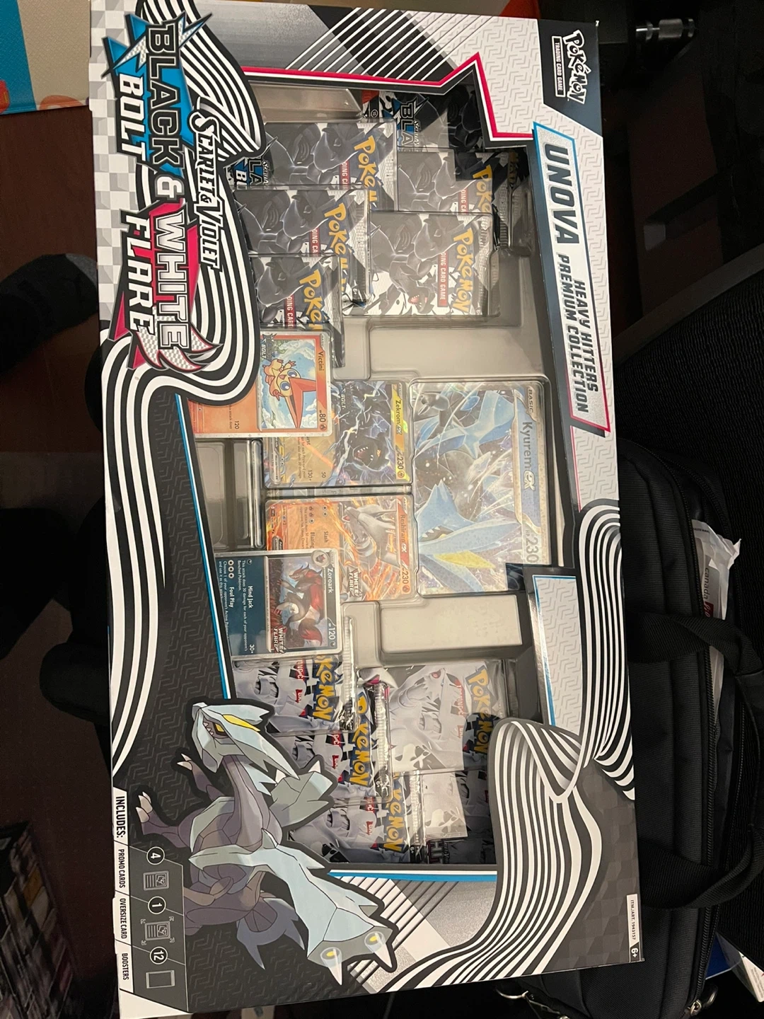 This Pokemon Premium Collection box features the Unova Heavy Hitters theme. It includes the Black & White Bolt Flare set along with other boosters and promo cards. The box contains 12 boosters and an oversized card. It's a great collection for Pokemon fans!