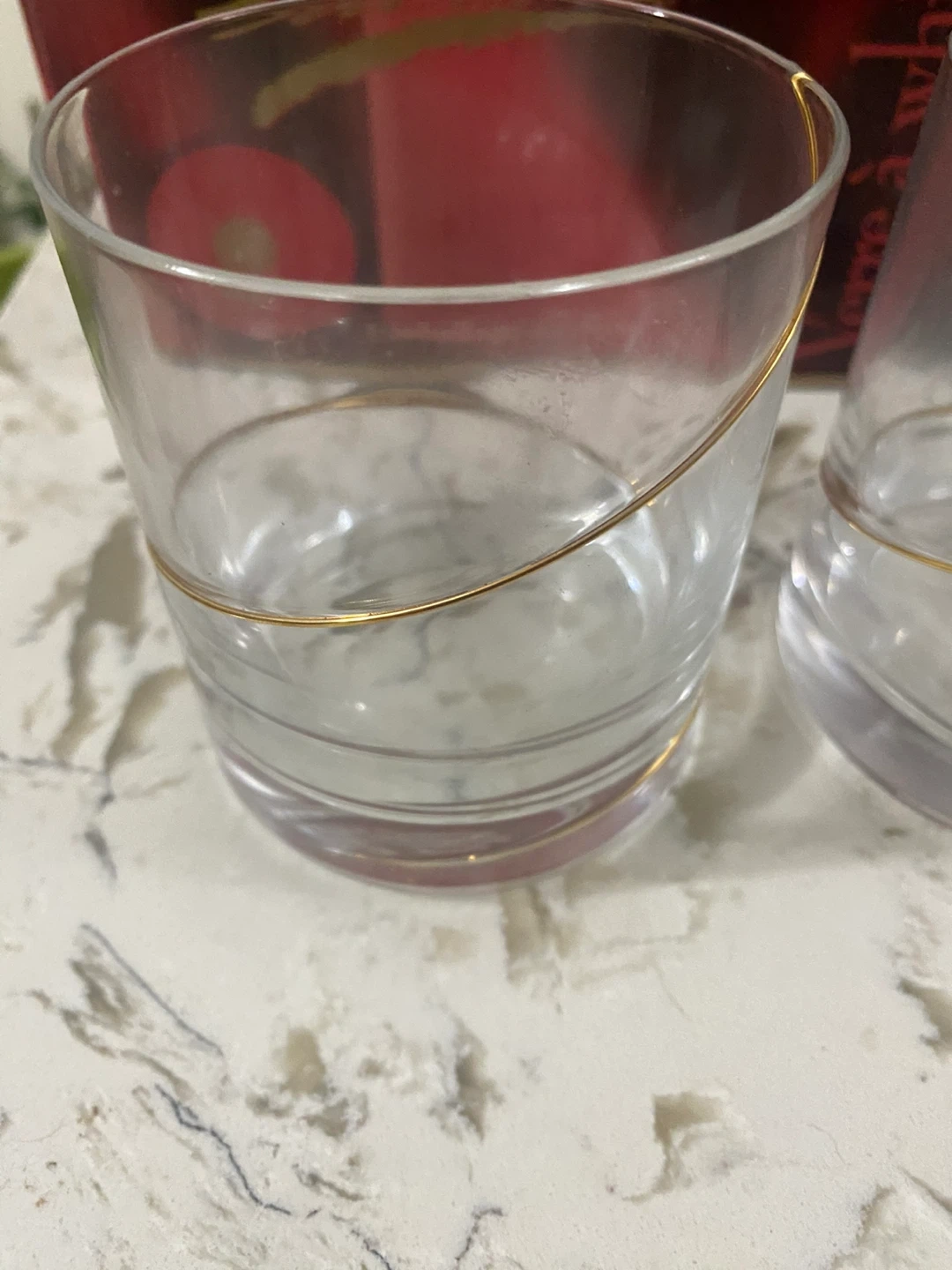 Set of 6 Savona glasses. Clear glass with a gold-coloured stripe design. Each glass is packaged in its original box. These glasses are ideal for enjoying your favourite spirits.