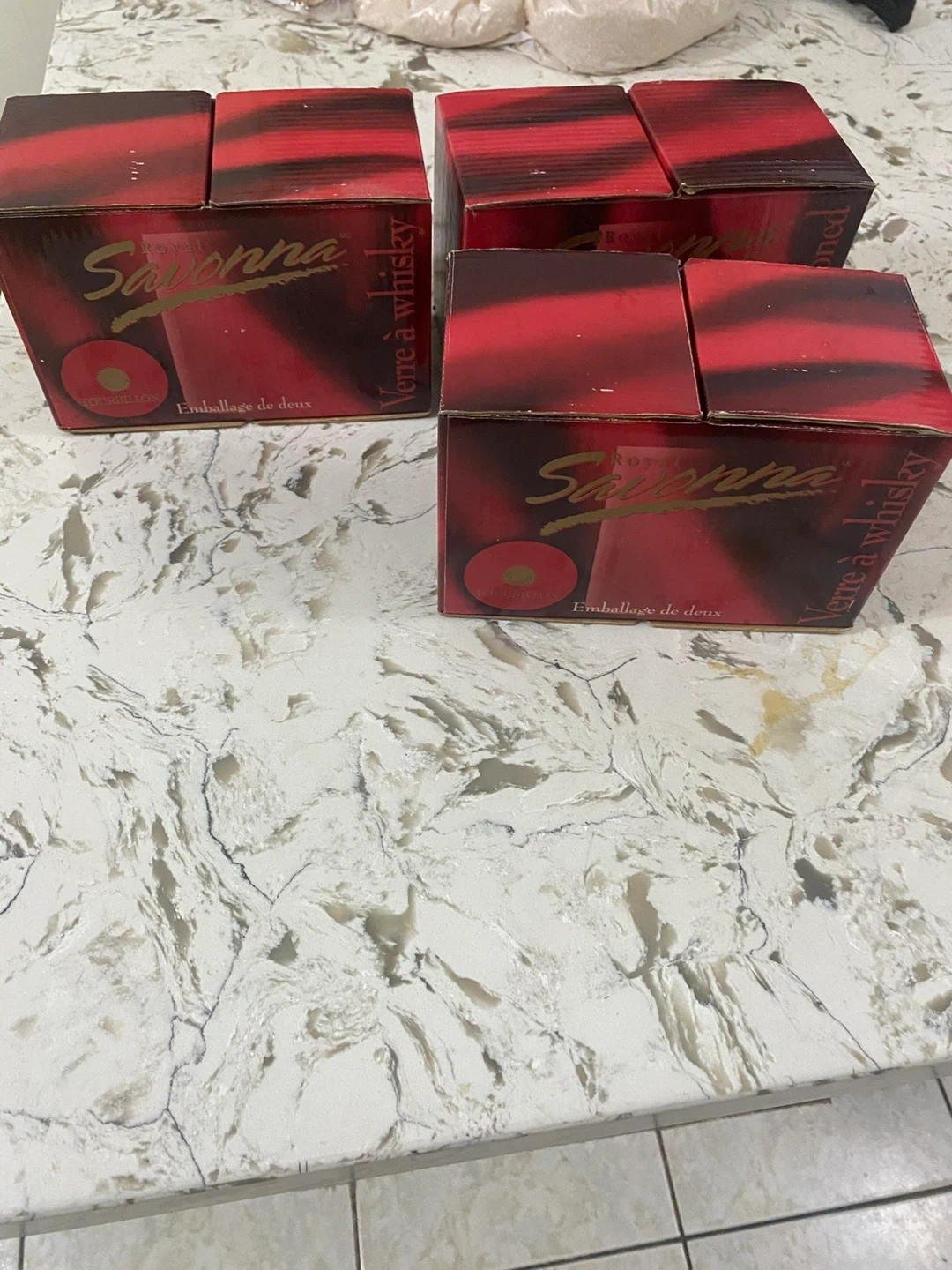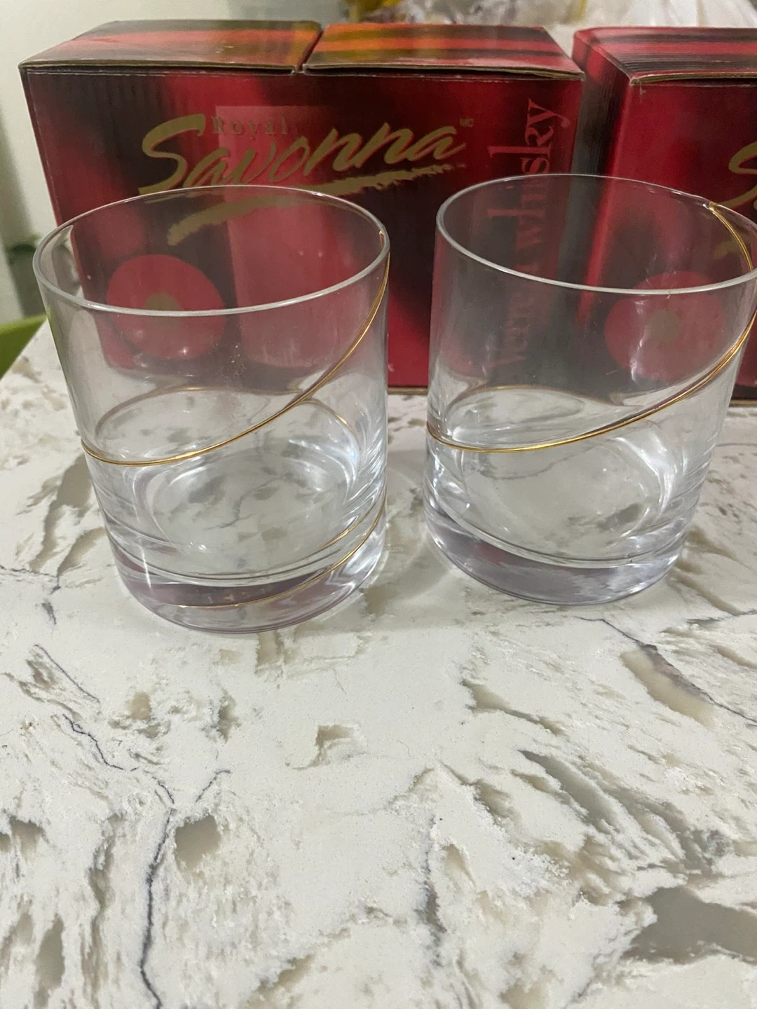 Set of 6 Savona glasses. Clear glass with a gold-coloured stripe design. Each glass is packaged in its original box. These glasses are ideal for enjoying your favourite spirits.