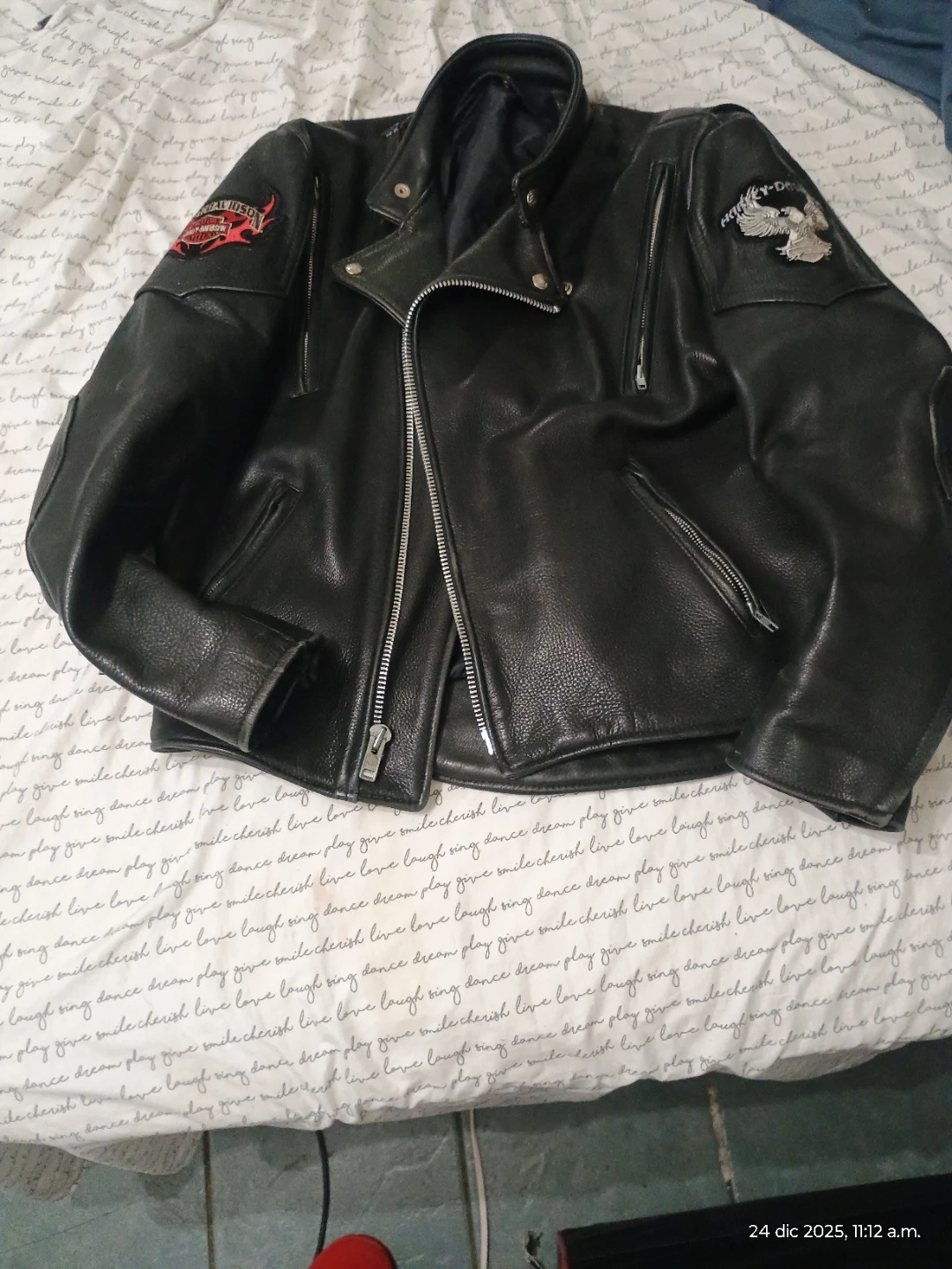 Harley-Davidson black leather jacket with cool patches on the sleeves! Perfect for riding or just looking stylish. The leather is in good condition.