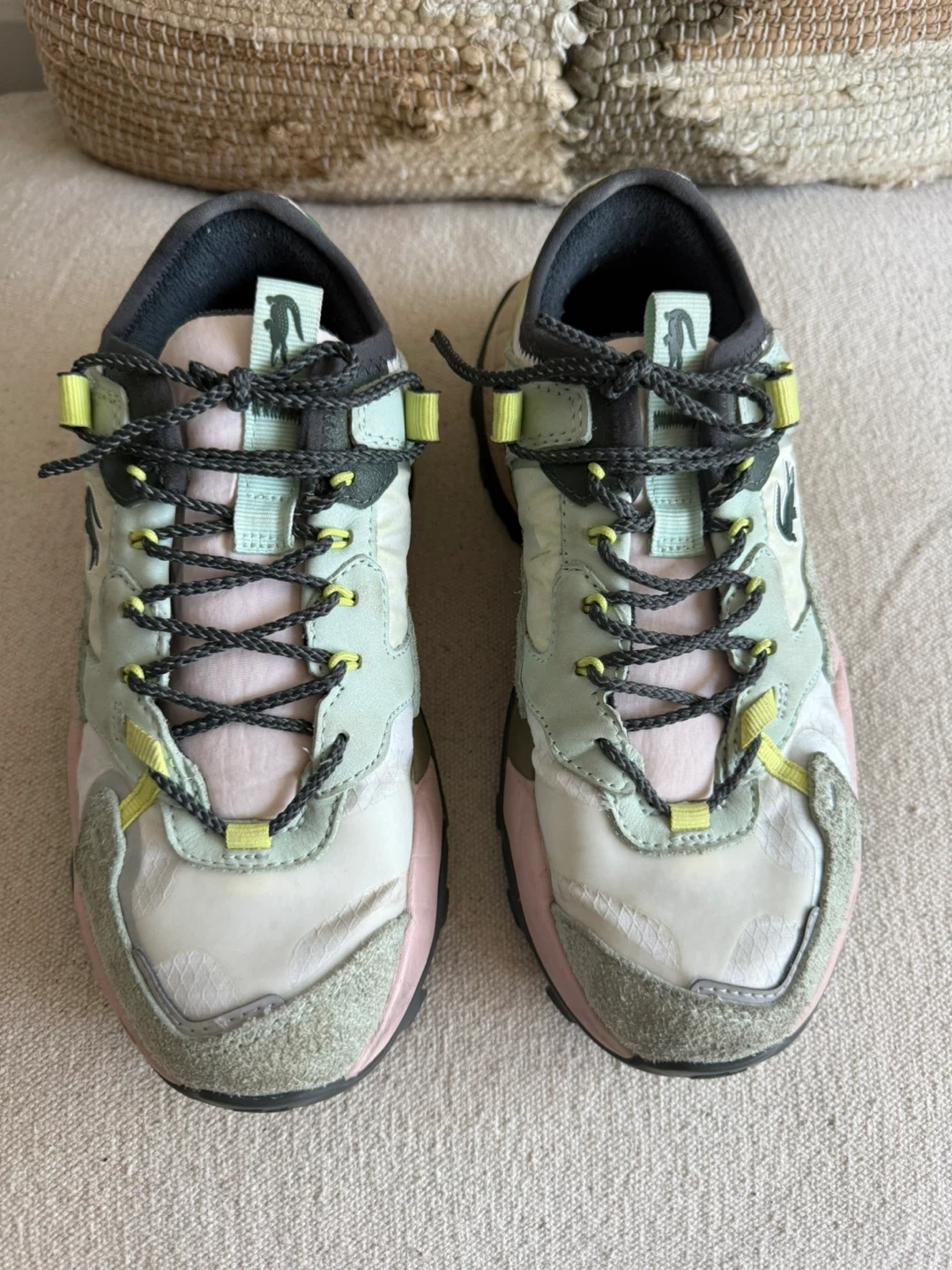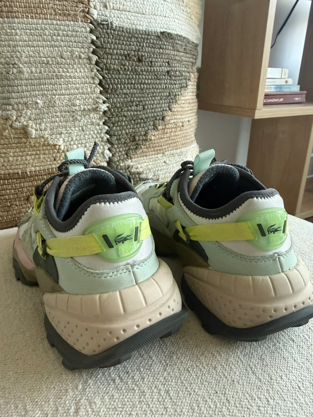 These Lacoste sneakers are a cool blend of mint green, pastel pink, and beige tones. They feature a durable rubber sole for great traction. extremely light and comfy