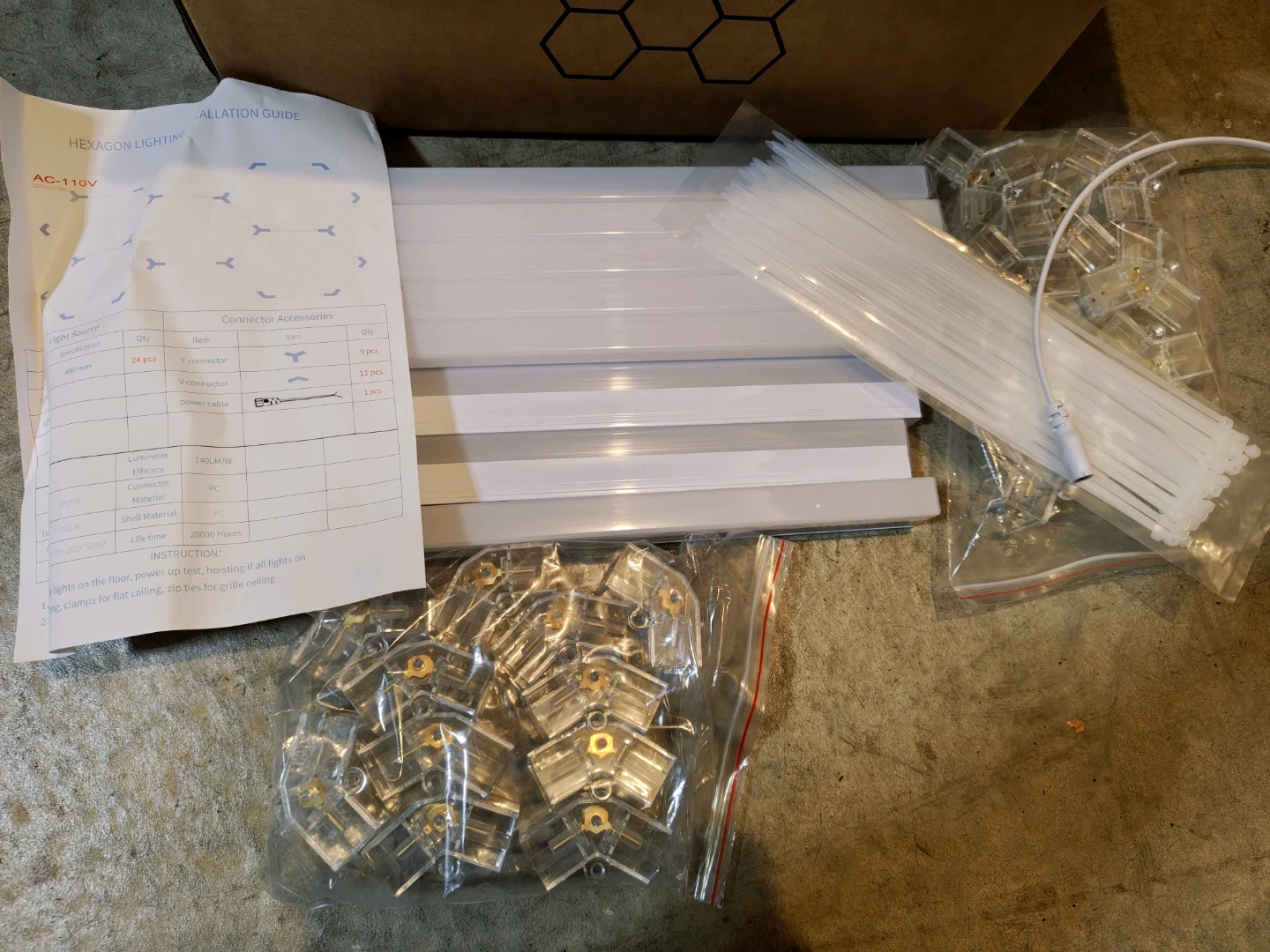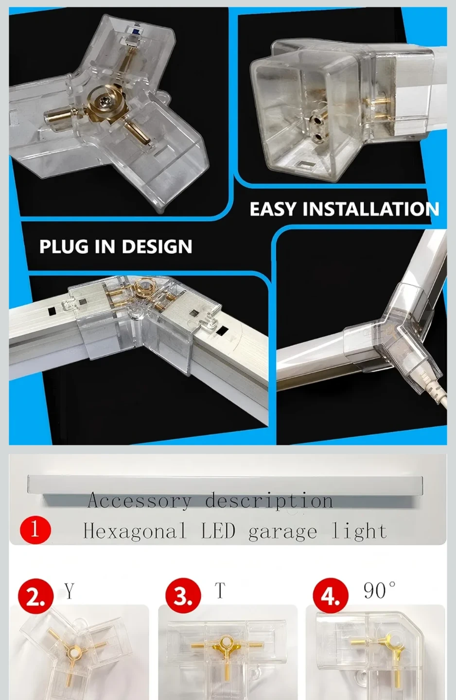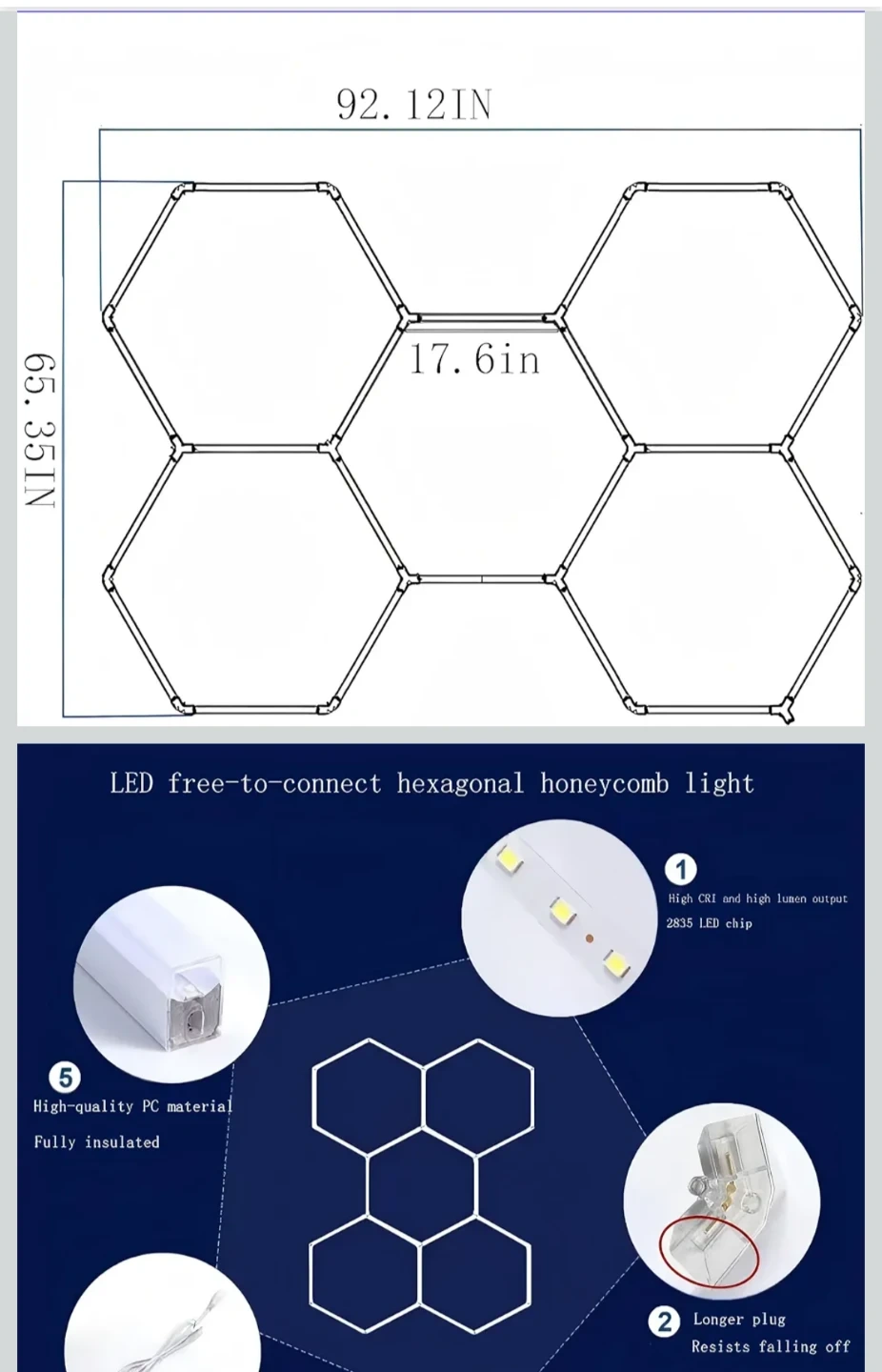 This LED free-to-connect hexagonal honeycomb light is perfect for illuminating your garage or workspace. It features a plug-in design for easy installation and is made from high-quality, fully insulated PC material. The light offers high CRI and high lumen output using 2835 LED chips. It's a great way to add modern, efficient lighting to your space!