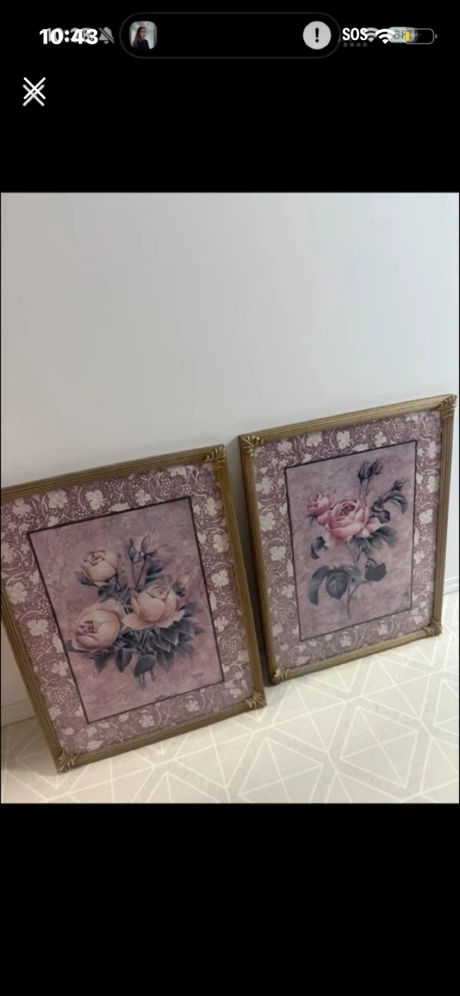 Two framed art prints featuring vintage-style roses and decorative borders. They're perfect for adding a touch of classic charm to your home décor. The frames have a subtle gold finish and ornate corner details. These pieces would complement a variety of interior design styles. Pick up cash only