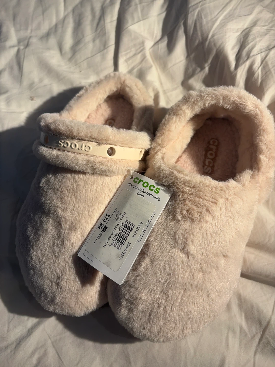 Brand new Crocs fluffy clogs in a super pretty light pink colour! They're women's size 7 and have never been worn, brand new with tags. they're so comfy and perfect if you're looking for a casual shoe. original price is 74.99. feel free to message me with any questions!๐