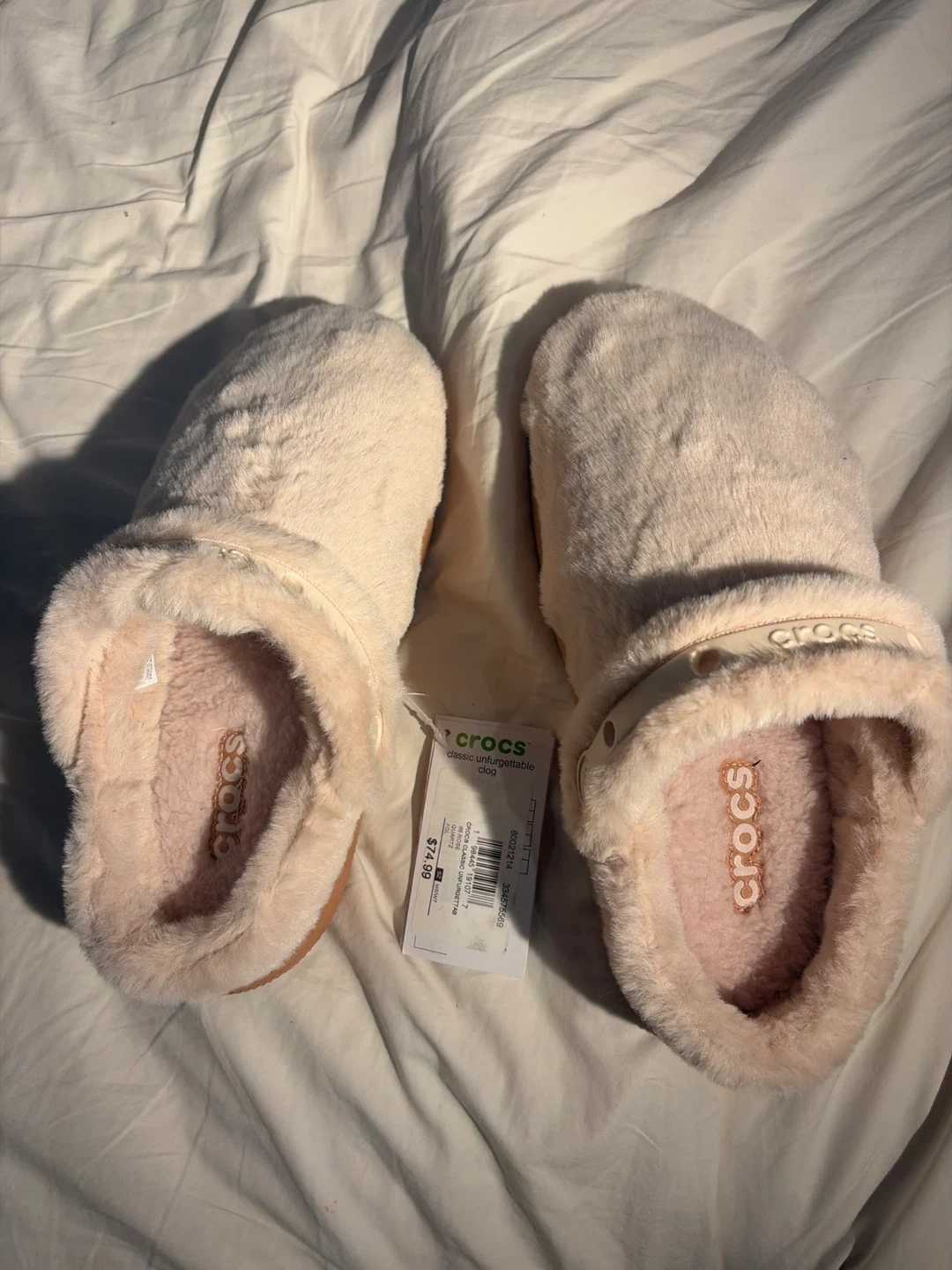 Brand new Crocs fluffy clogs in a super pretty light pink colour! They're women's size 7 and have never been worn, brand new with tags. they're so comfy and perfect if you're looking for a casual shoe. original price is 74.99. feel free to message me with any questions!๐