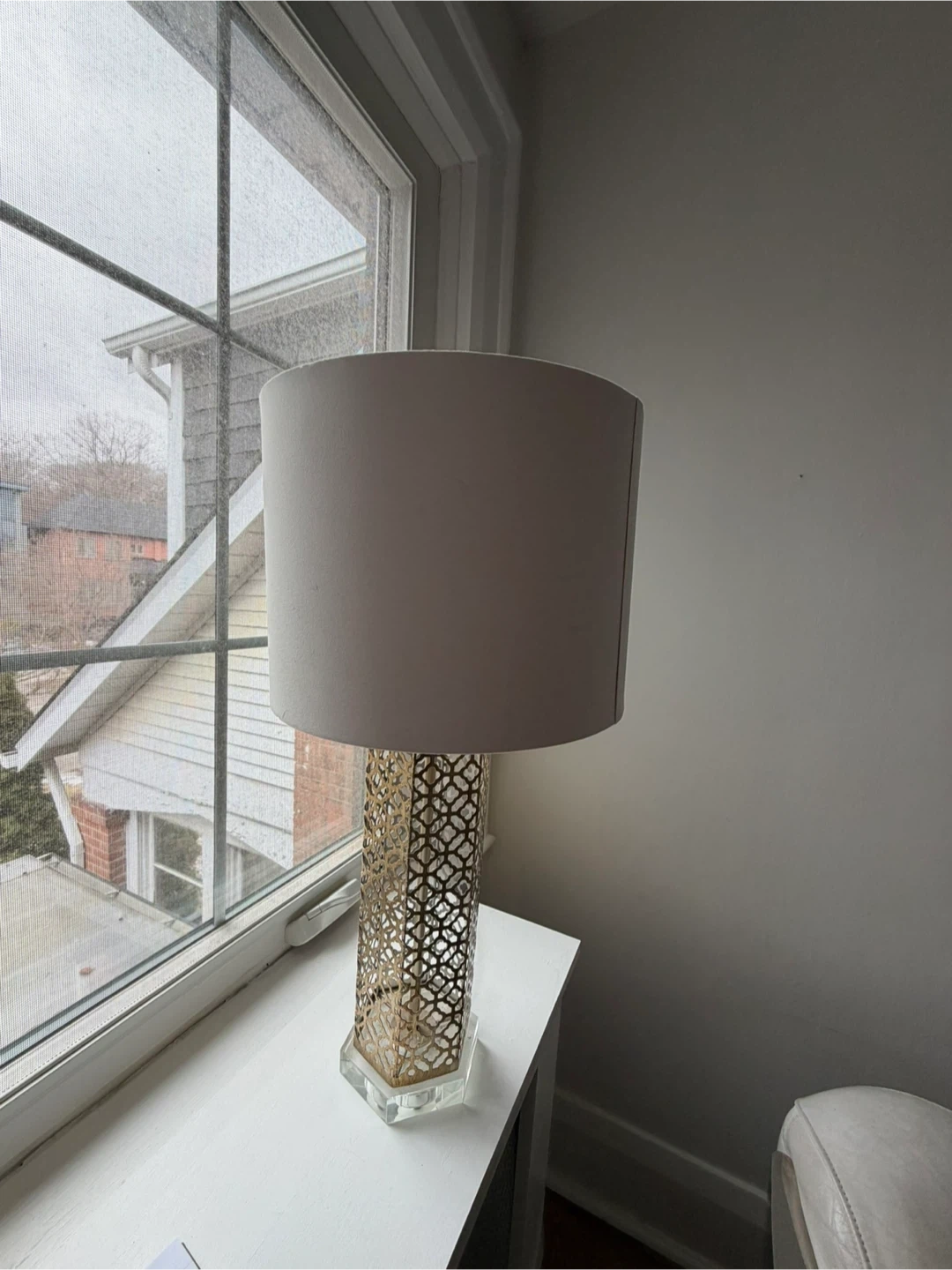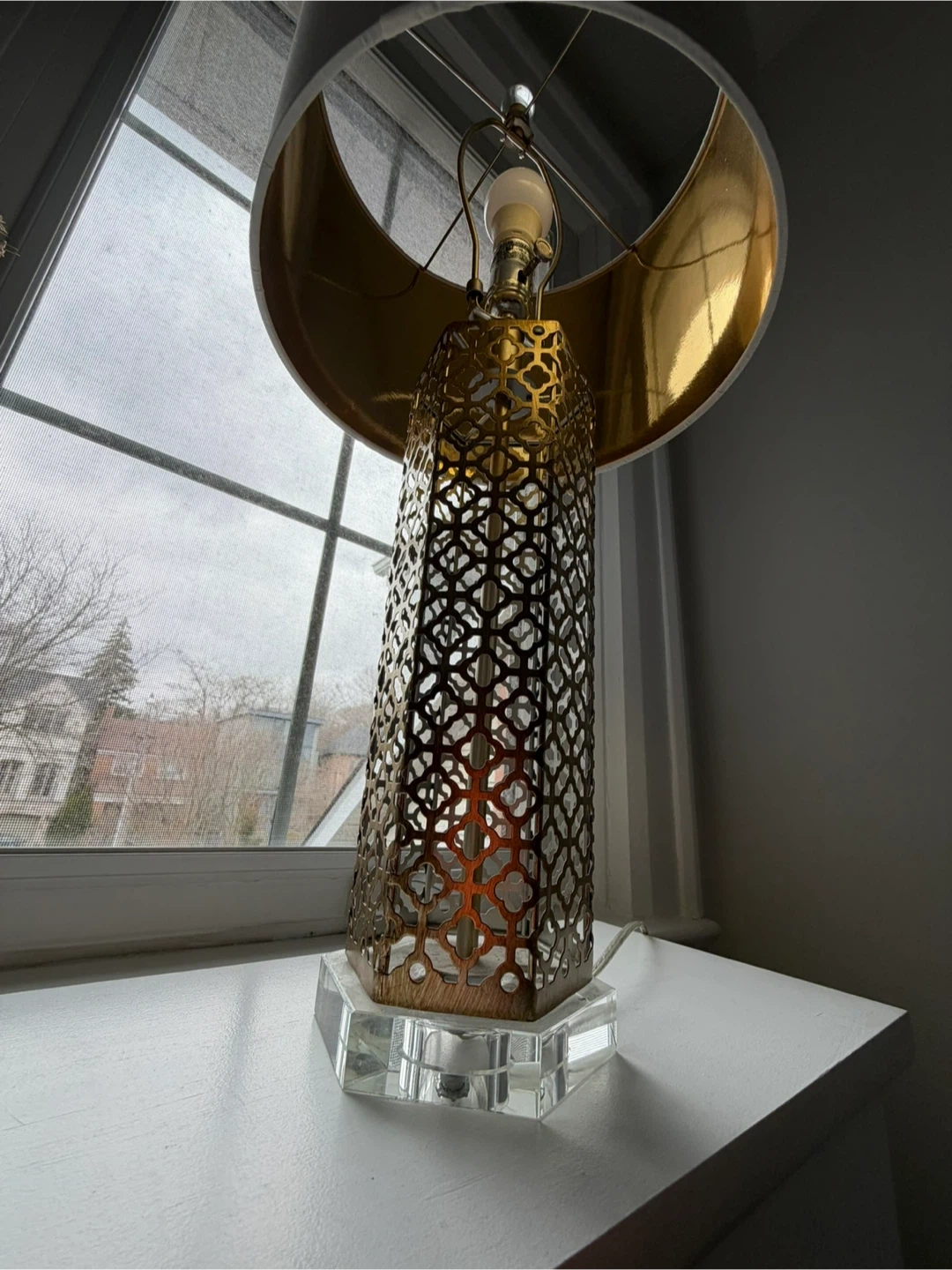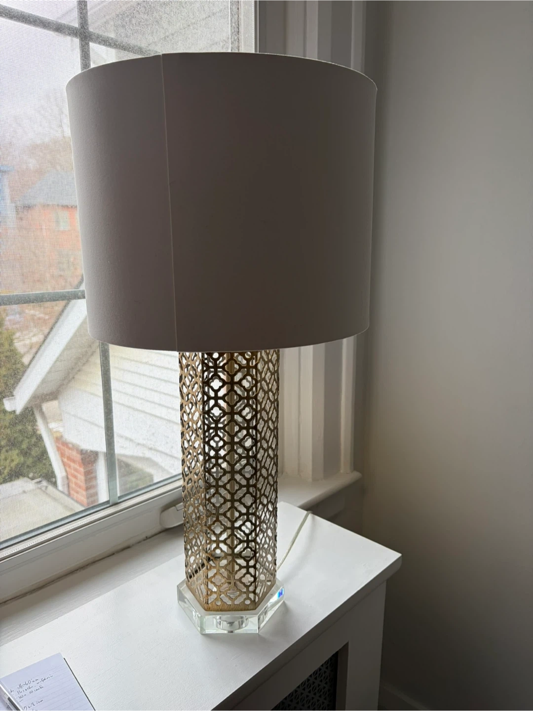 table lamp, gold lamp, lattice lamp, metal lamp, crystal base lamp, tall table lamp, decorative lamp, glam lamp, modern lamp, bedroom lamp, living room lamp, accent lamp, designer style lamp, home decor lighting