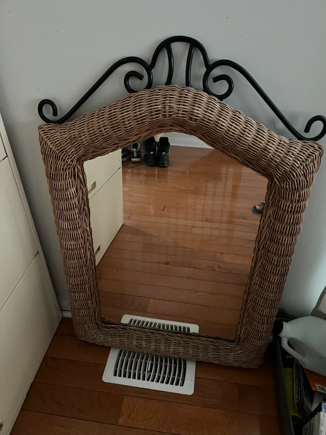 This decorative mirror features a natural wicker frame with a black metal scrollwork accent at the top. It's a lovely piece to add a touch of bohemian or coastal charm to any room. The woven texture of the wicker is unique and eye-catching.