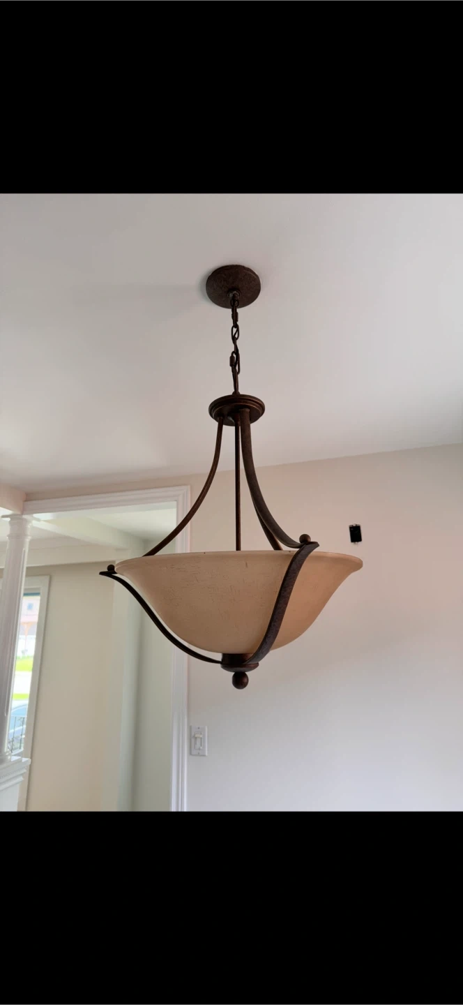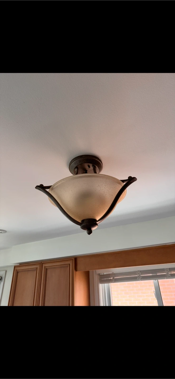 Two good condition ceiling lights. Adds a warm glow to any room. This pendant light has a bronze finish and a frosted glass bowl shade. It's perfect for entryways or dining areas.