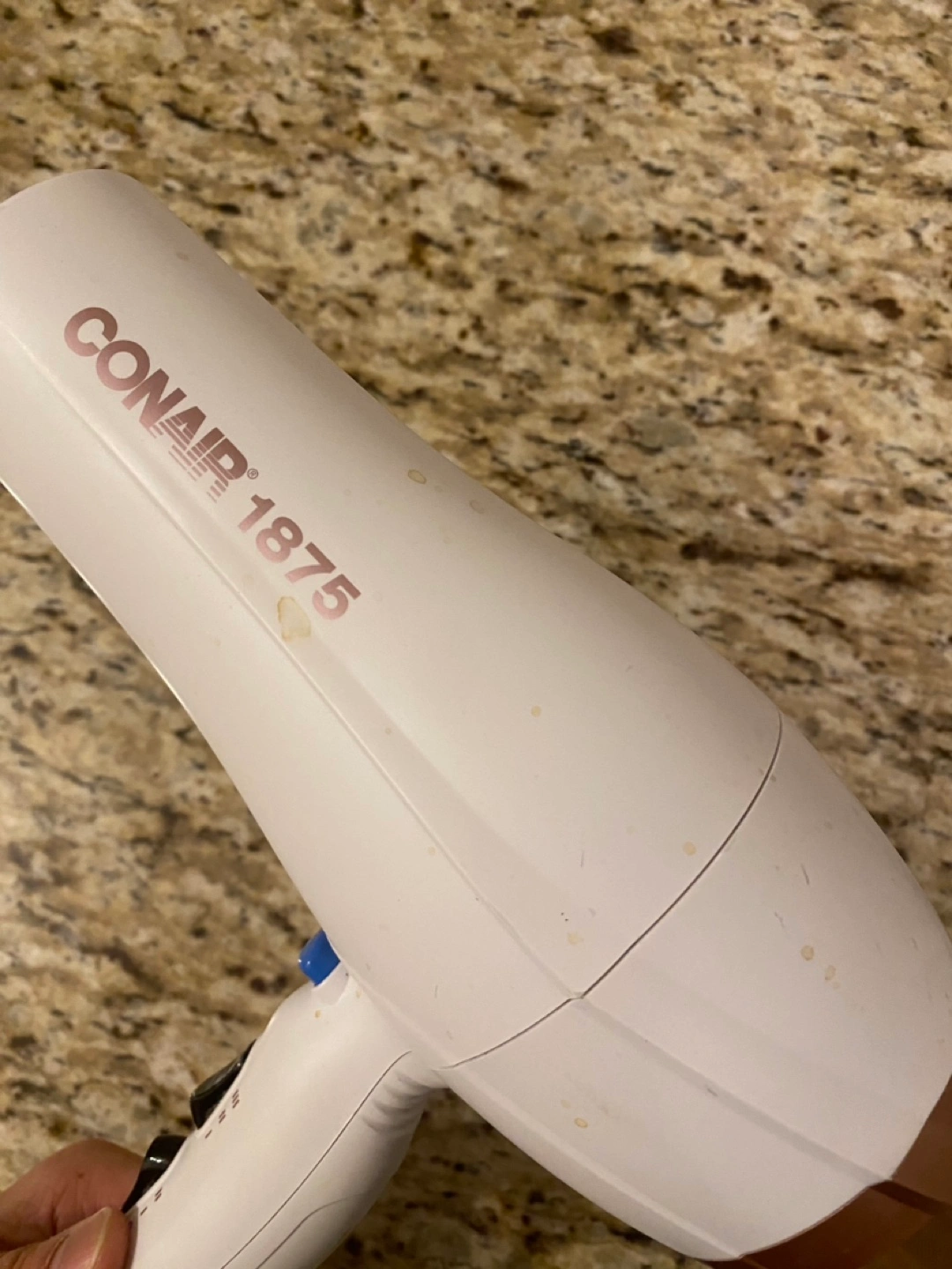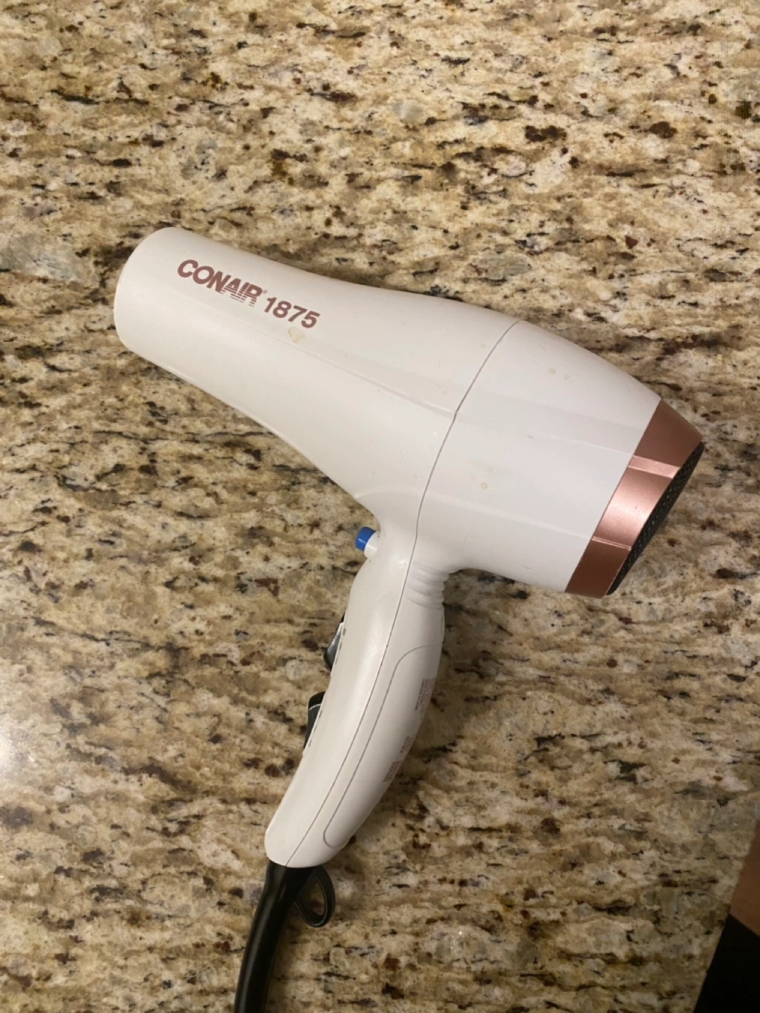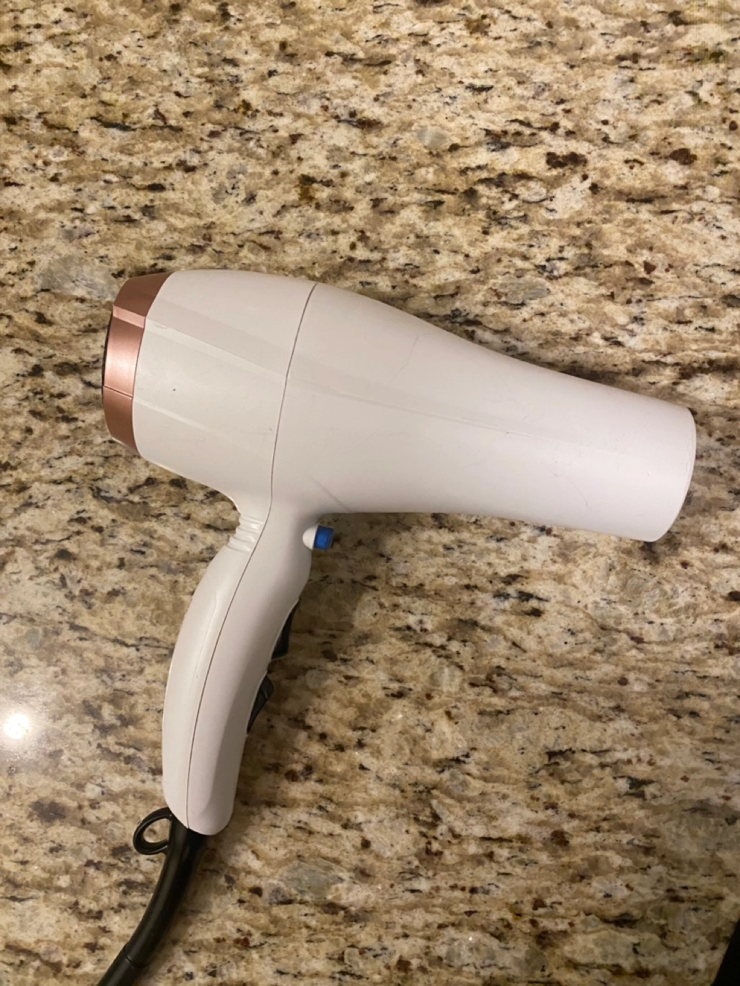 White and rose gold hair dryer. Features multiple heat and speed settings. Some minor cosmetic imperfections.