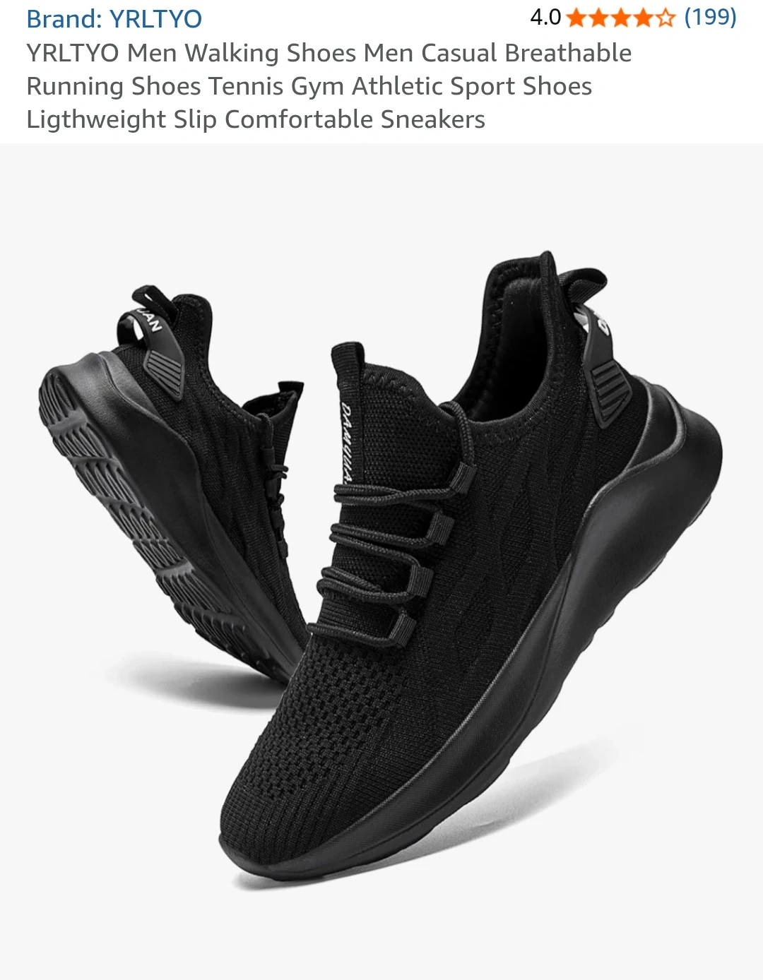 54Selling a pair of YRLTYO men's walking/running shoes in black. They are casual, breathable, and lightweight with a slip-on design. Great for tennis, the gym, or athletic activities!