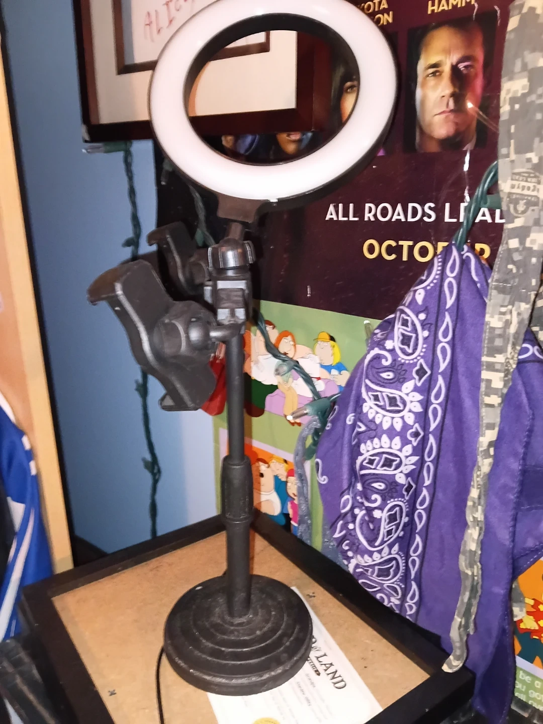 This is a desktop ring light with an adjustable phone holder. It has a sturdy black base and is powered by USB. The light is perfect for creating content or for better video calls.
