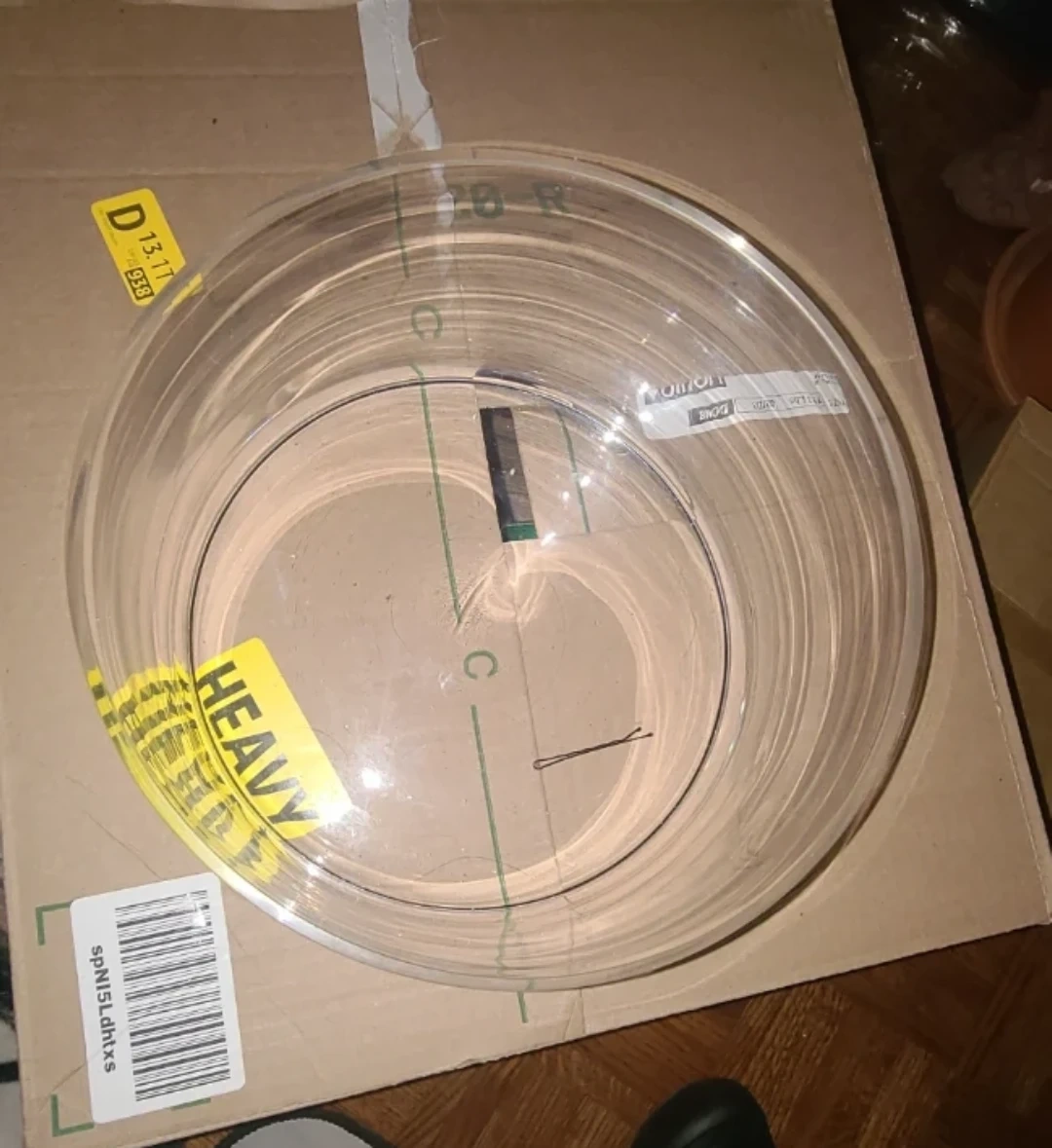 This is a clear glass bowl, hand-crafted by Artland. It measures 15 inches in diameter and 5.5 inches in height. It's suitable for serving or as a decorative piece.