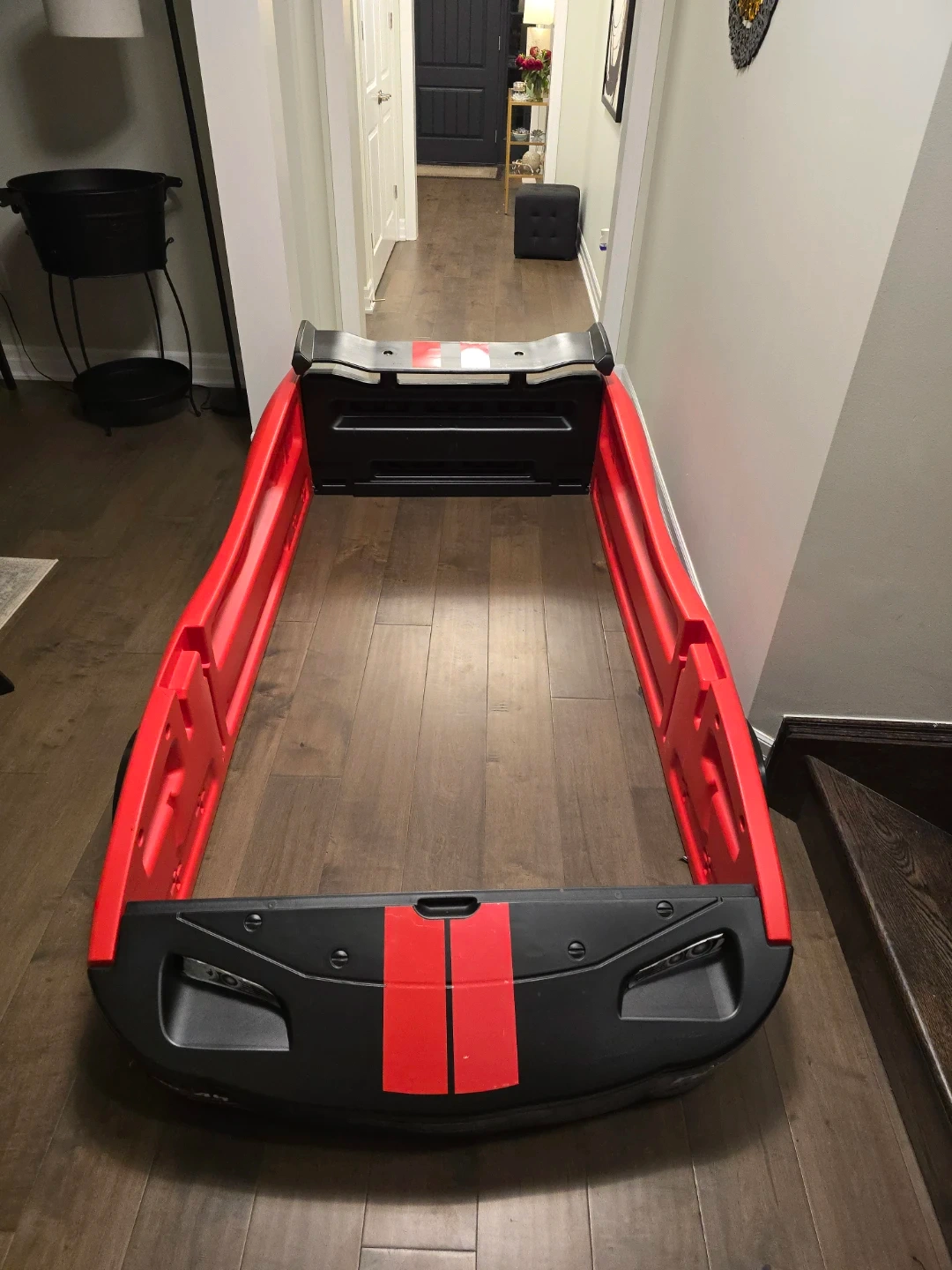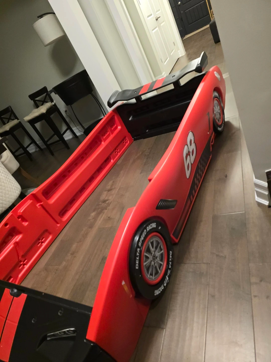 Red and black toddler bed shaped like a race car. It features "Delta Speed Racing" text on the wheels. This bed's unique design makes transitioning to a big kid bed fun!