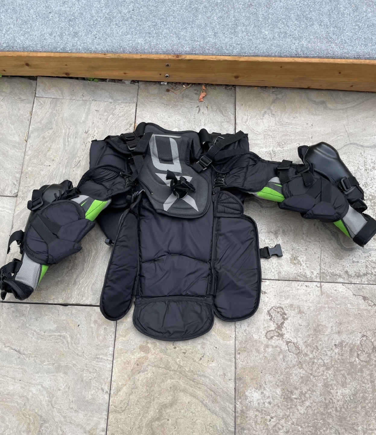 Selling a set of RBK hockey shoulder pads for adults. They're in good condition and ready for the ice! The pads are black, grey, and green.