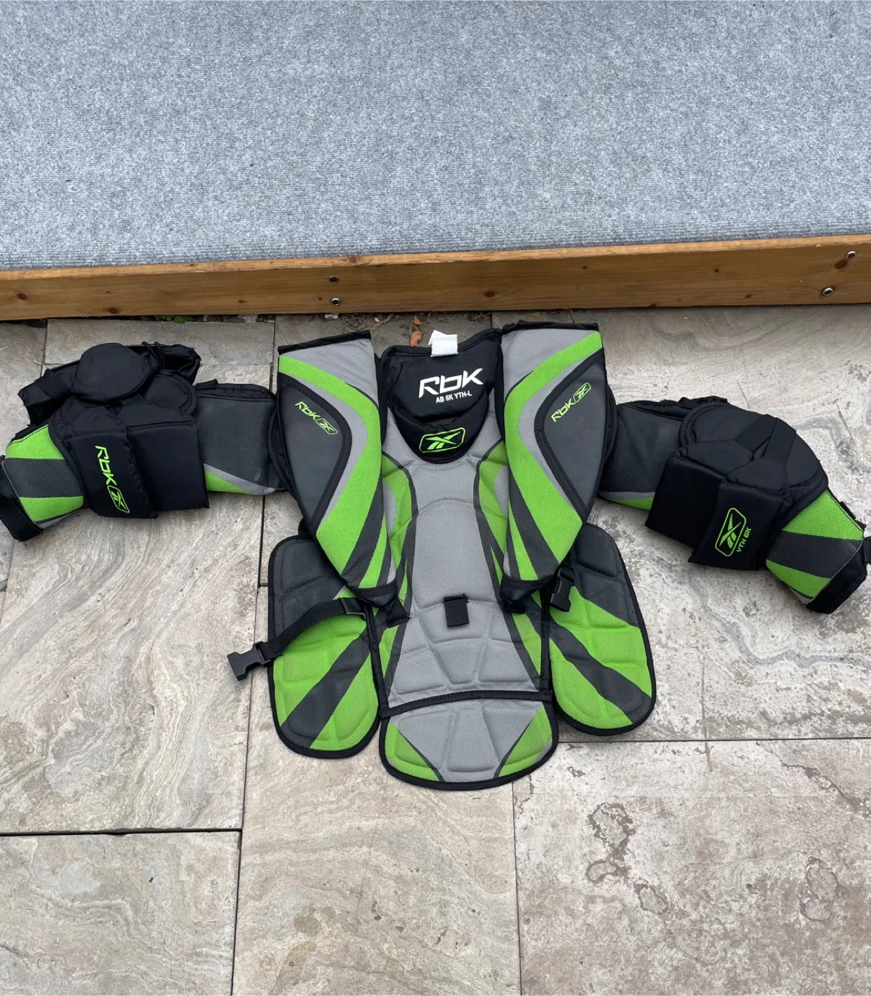Selling a set of RBK hockey shoulder pads for adults. They're in good condition and ready for the ice! The pads are black, grey, and green.