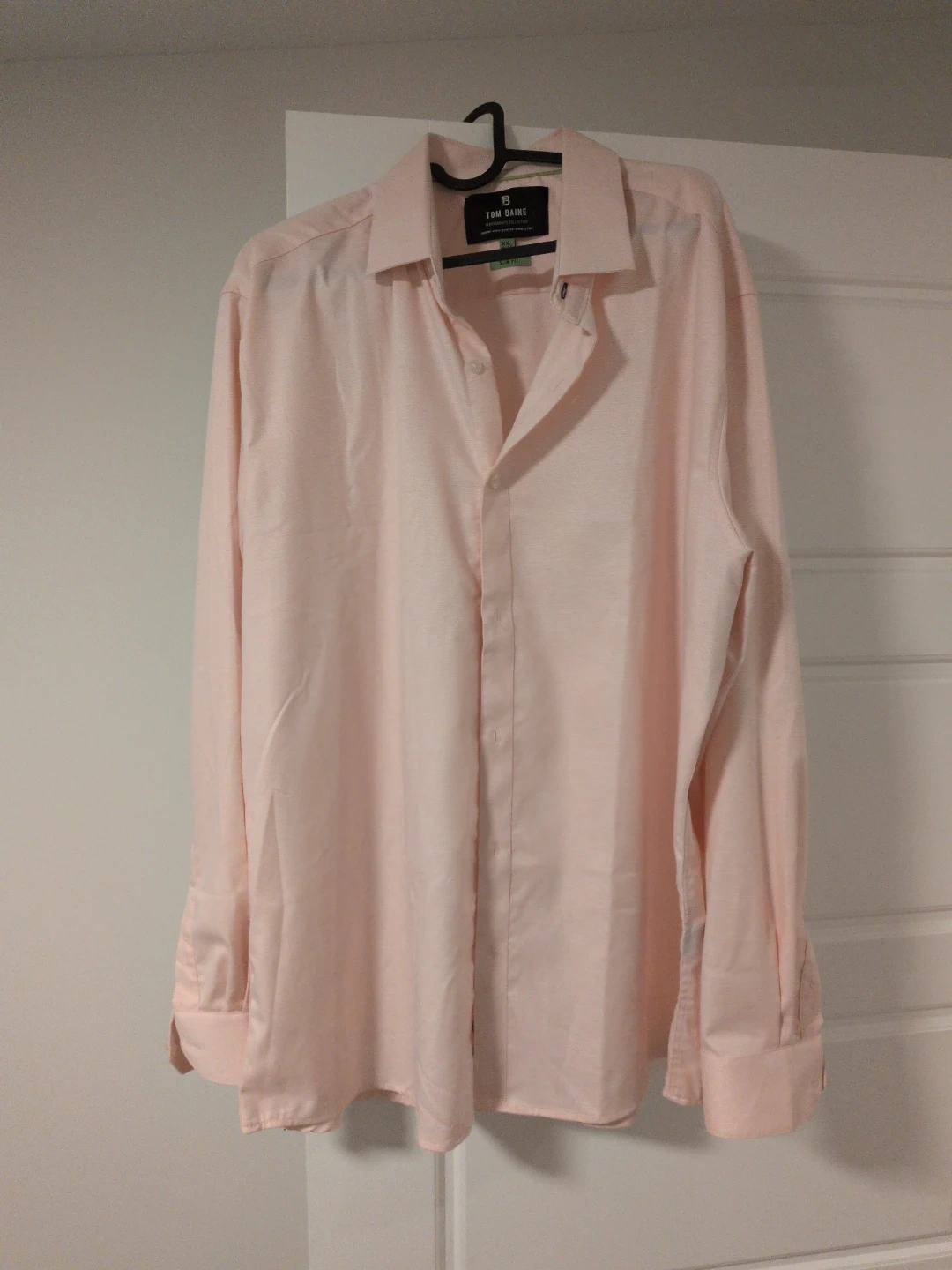 This is a men's long-sleeve dress shirt from Tom Baine. It's a soft pink colour. Size is XXL slim fit