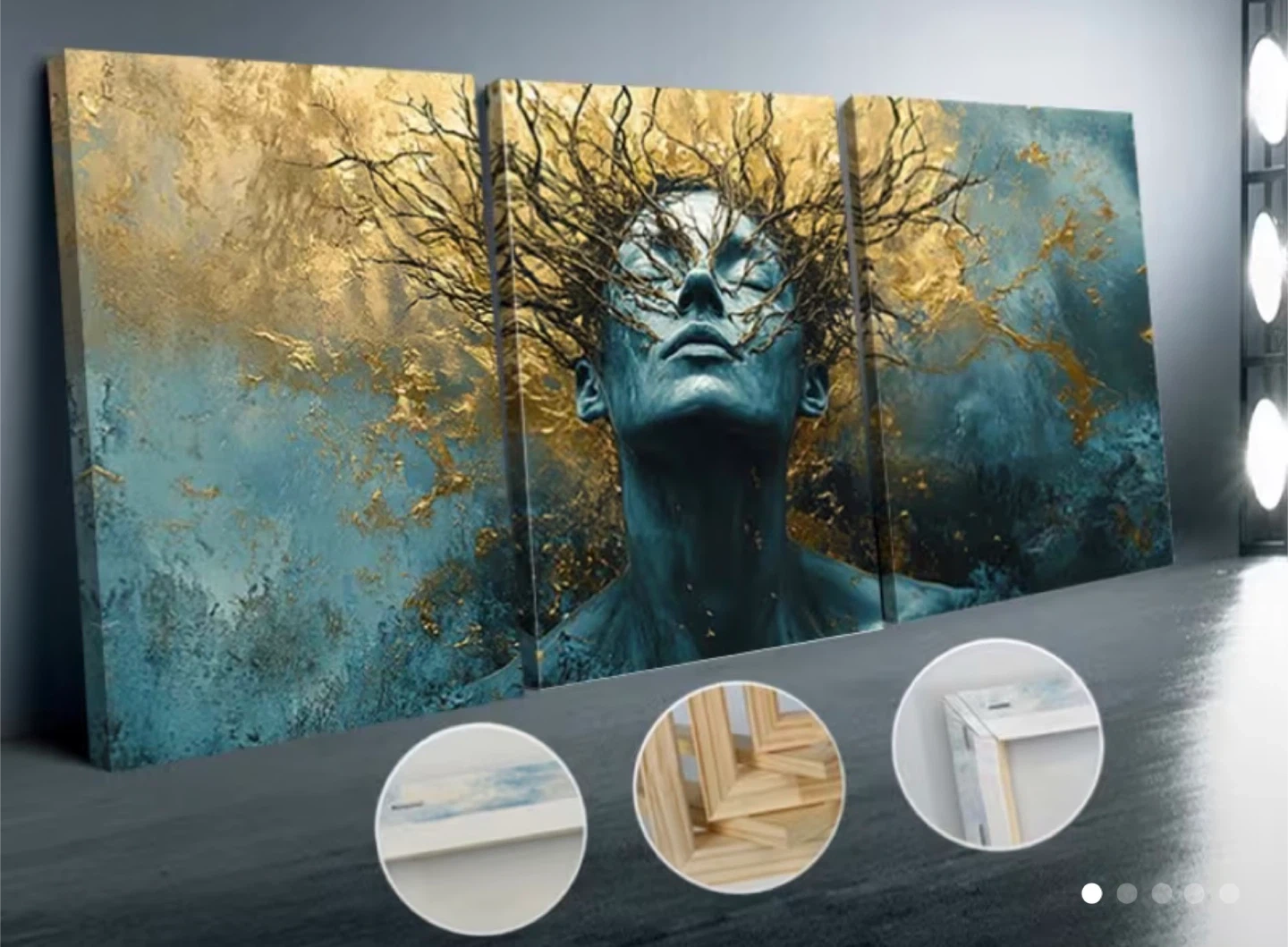 This is a triptych canvas art print featuring an abstract depiction of a woman with striking gold and teal colours. The artwork is printed on canvas and stretched over wooden frames, ready for hanging. It's a beautiful statement piece for any room!