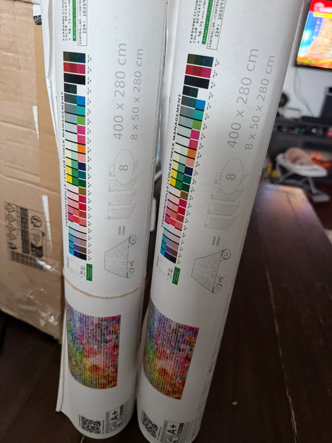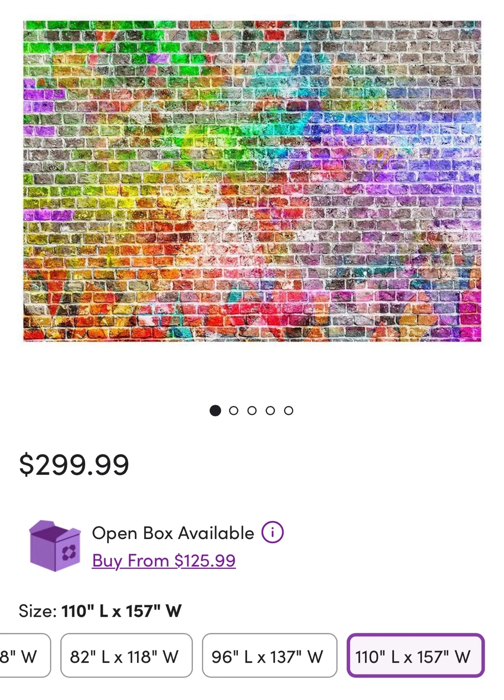 Vibrant graffiti brick wallpaper mural. It's 110 inches long by 157 inches wide. This wallcovering features a colourful, spray-painted brick design. It's great for adding a unique urban art touch to any room!