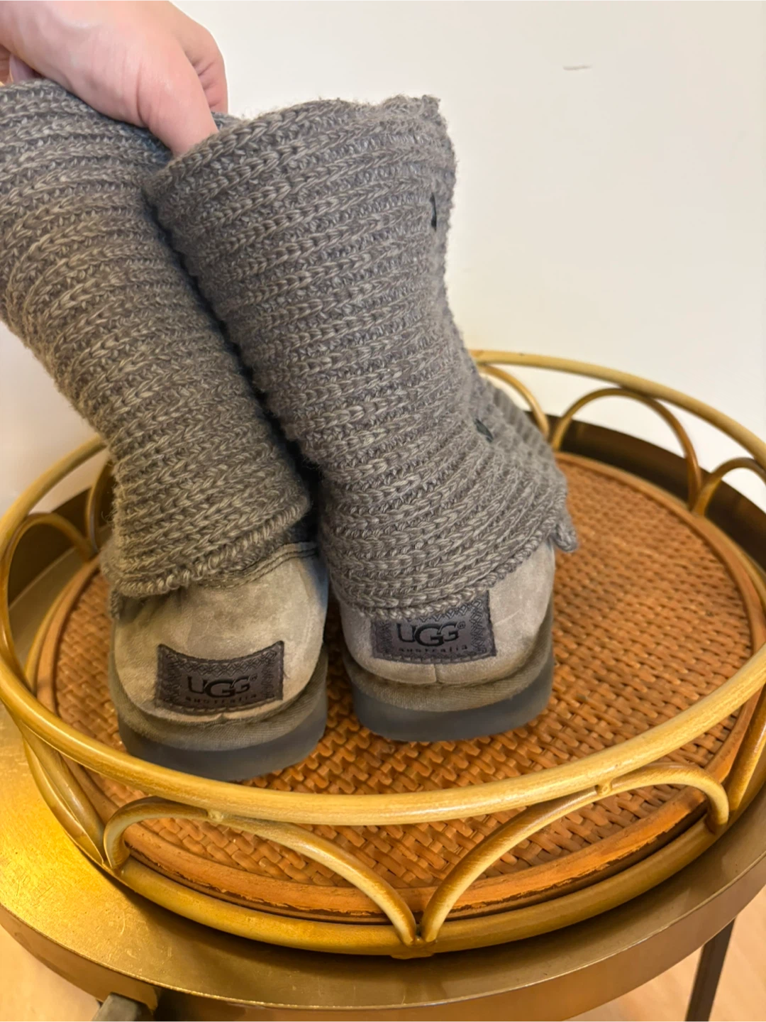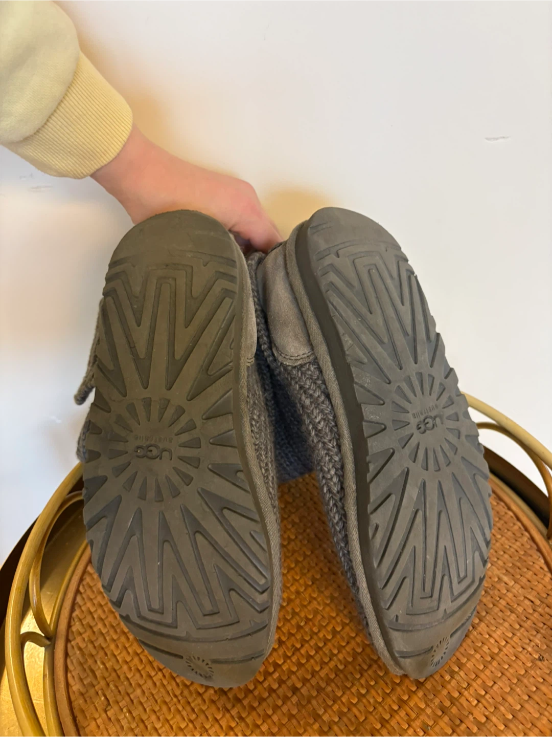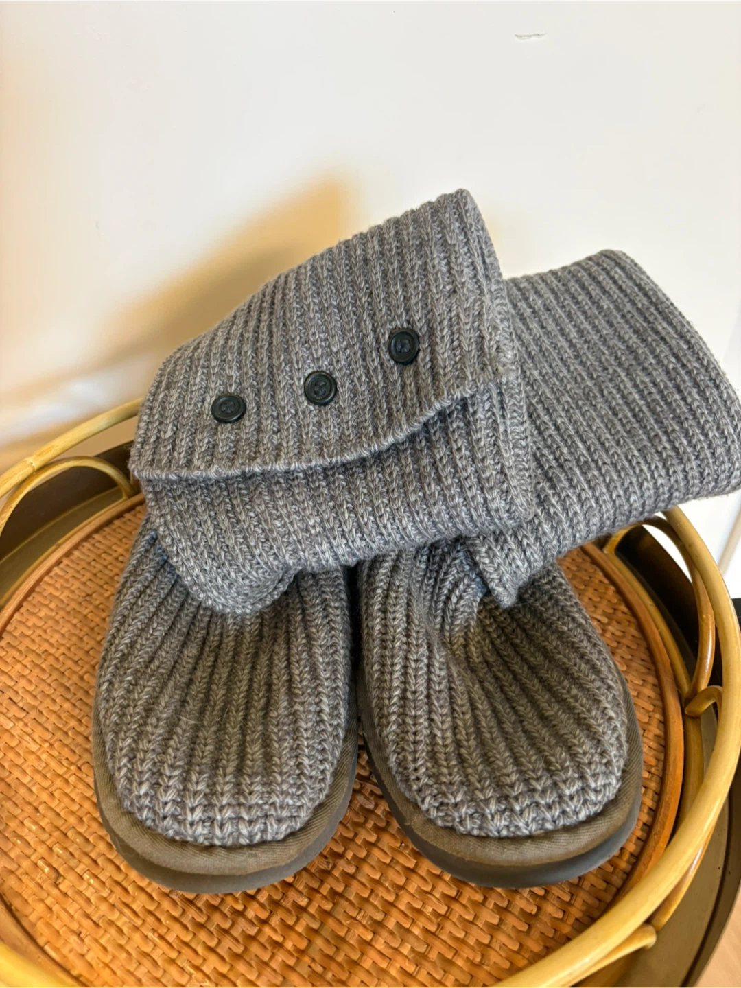 Grey Ugg Australia boots with a knit cuff and button detail. These boots feature a cosy feel and the classic Ugg sole. Perfect for keeping your feet warm.