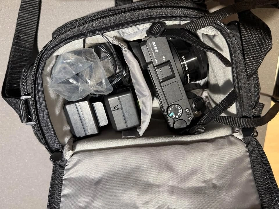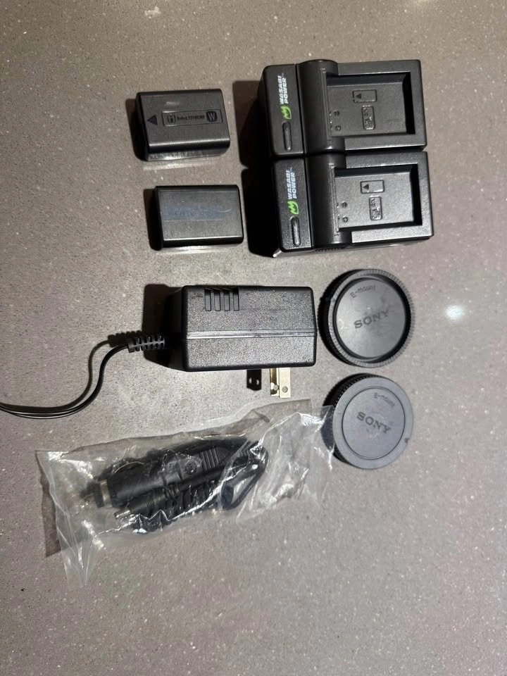 Comes with a genuine Sony Bag, caps, batteries, hotshoe cover, chargers, and an sd card.