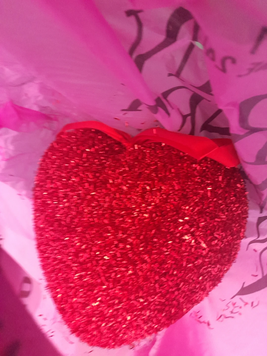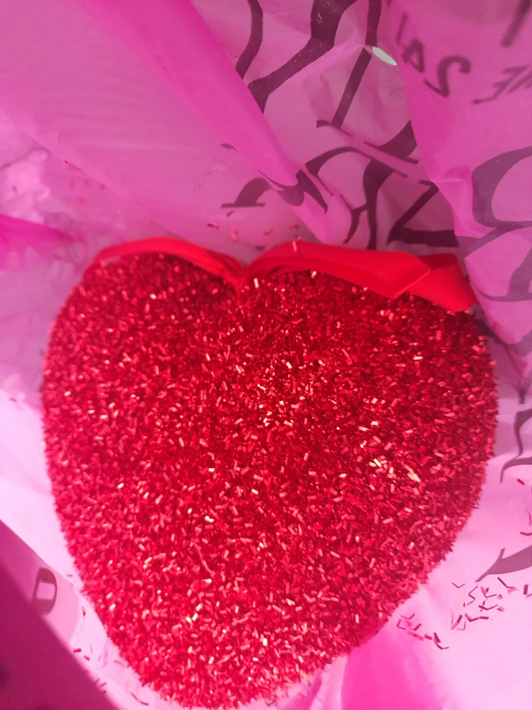 This is a sparkly red heart-shaped decoration. It's covered in glitter and has a red ribbon at the top. It's a festive piece for any occasion!