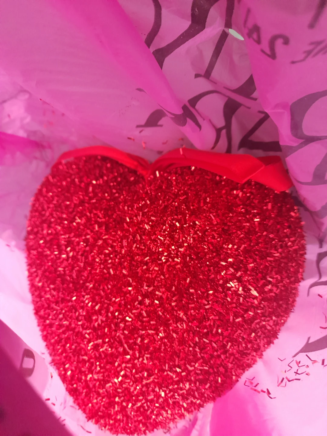 This is a sparkly red heart-shaped decoration. It's covered in glitter and has a red ribbon at the top. It's a festive piece for any occasion!