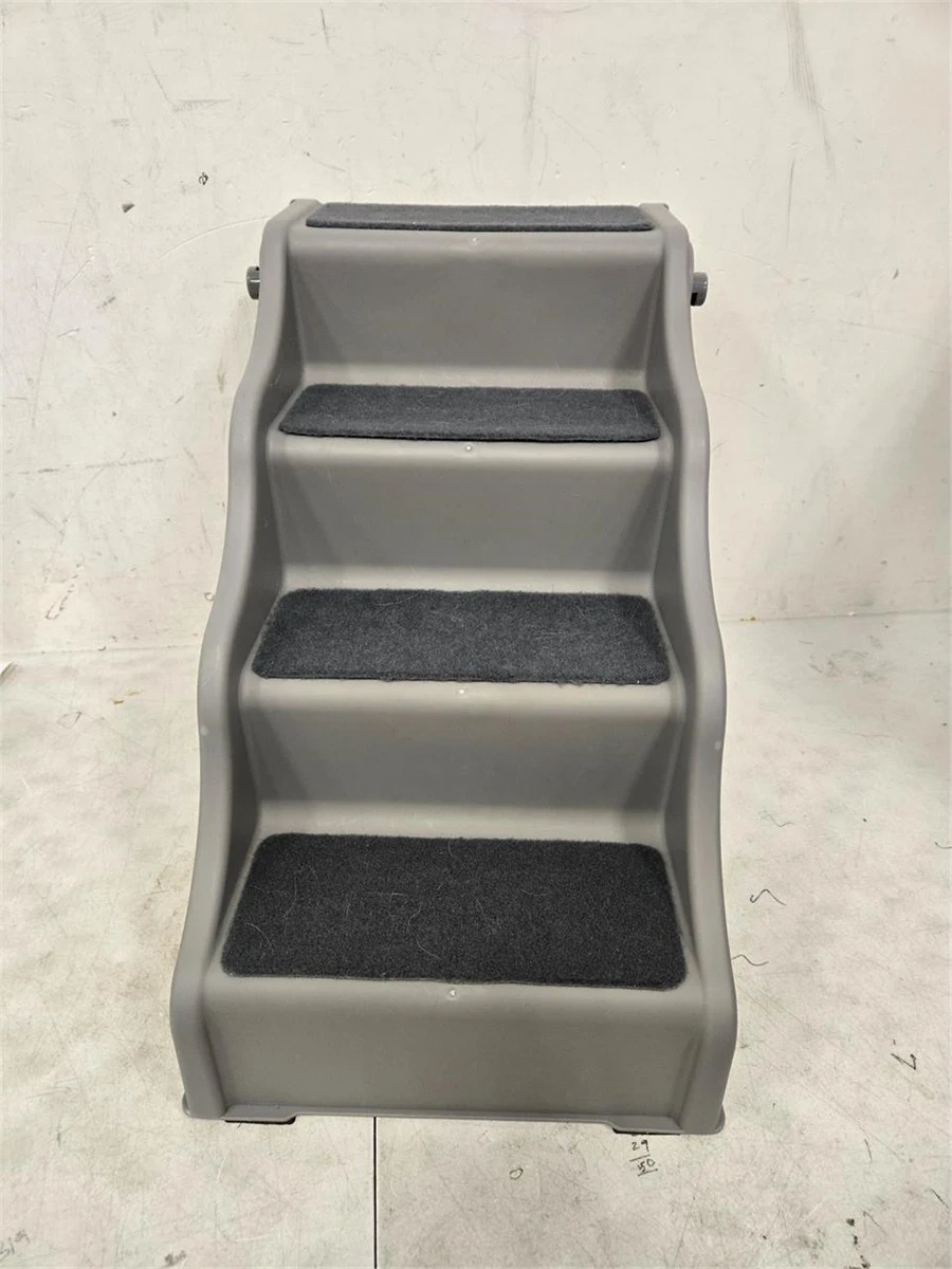 Four-step pet stairs for small to medium dogs. Features carpeted treads for traction and comfort. Great for pets with mobility issues to reach elevated surfaces.