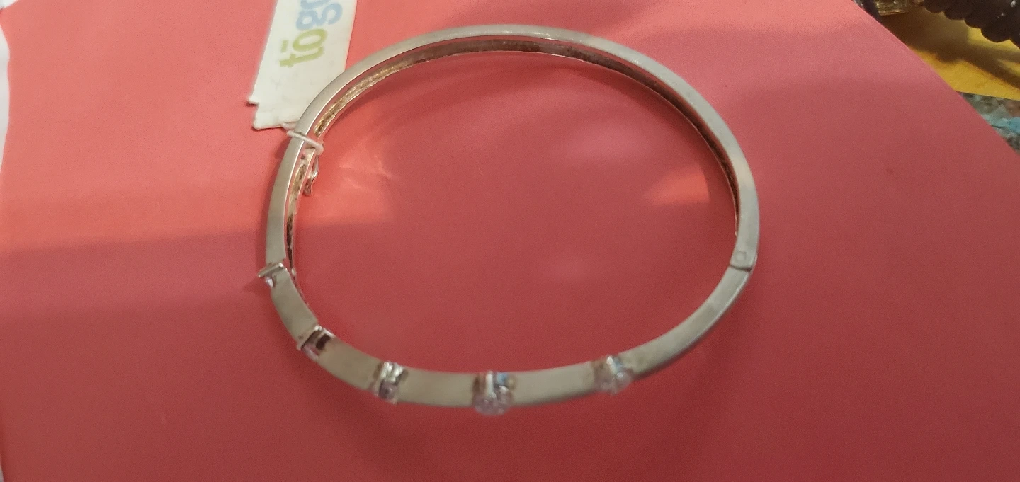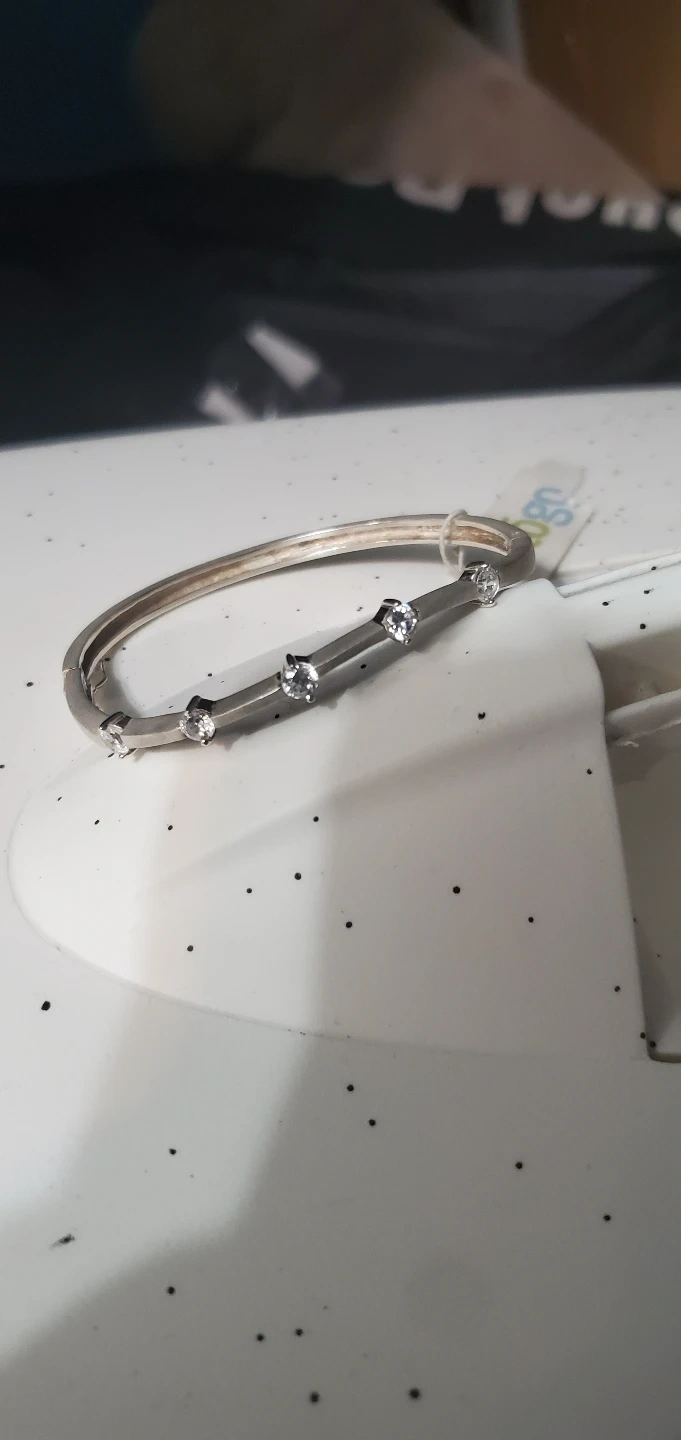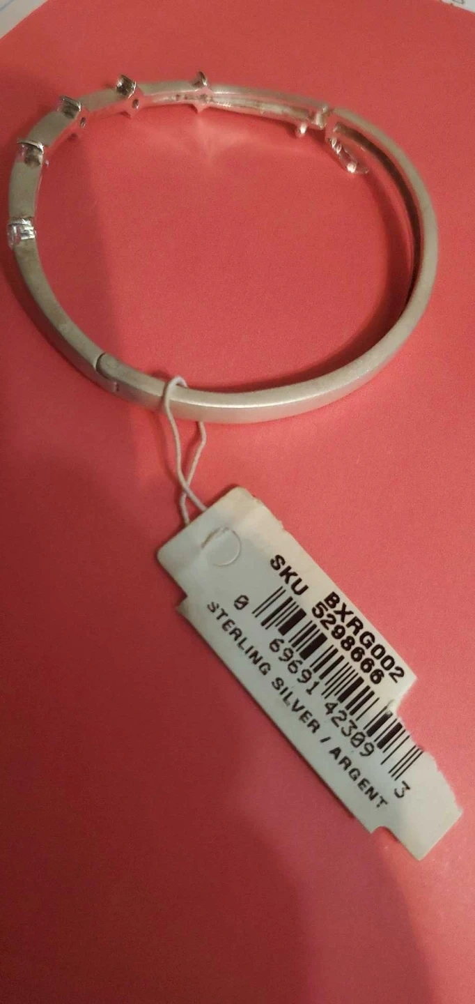 Elegant sterling silver hinged bangle bracelet. Features a curved design accented with clear cubic zirconia stones. New with tags. SKU: BXBG002