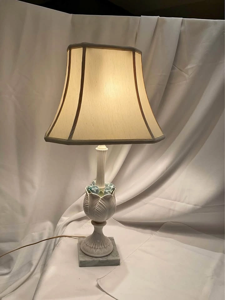 Stunning vintage porcelain table lamp, made in Italy. Features beautiful, delicate eggshell blue flowers with no chips. In pristine condition. Has a marble Carrera base. * No shade *. From a smoke & pet free home. Cash Only - Richmond Hill / Bathurst & King Rd.